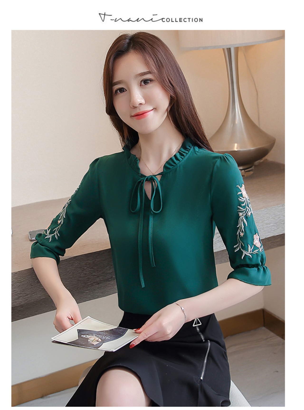 《入荷待ち》五分丈 ブラウス シャツ 刺繍 花 フラワー ハイネック フリル リボン 大人可愛い オシャレ イエロー ピンク グリーン ブラック ホワイト