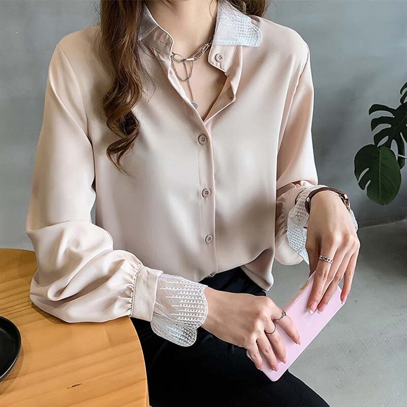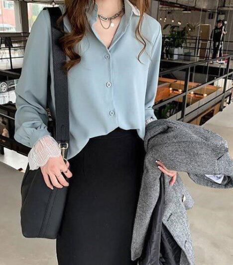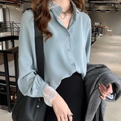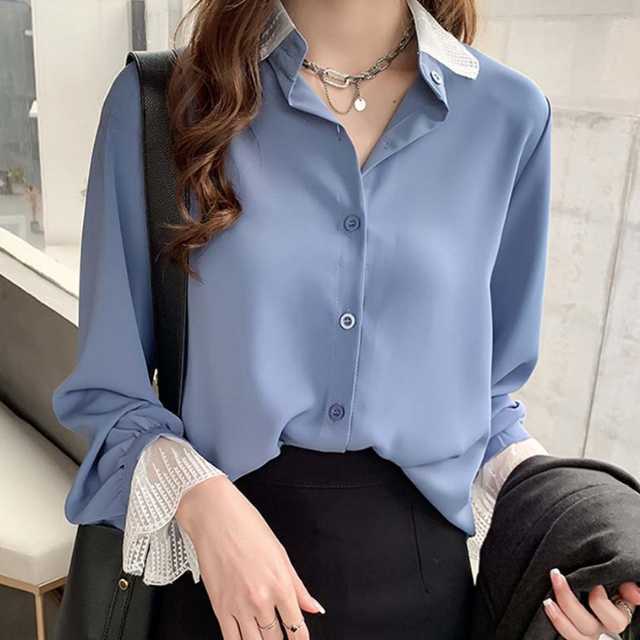 《入荷待ち》ブラウス シャツ バイカラー オシャレ オフィスカジュアル 長袖 レース ブルー グリーン レッド ベージュ