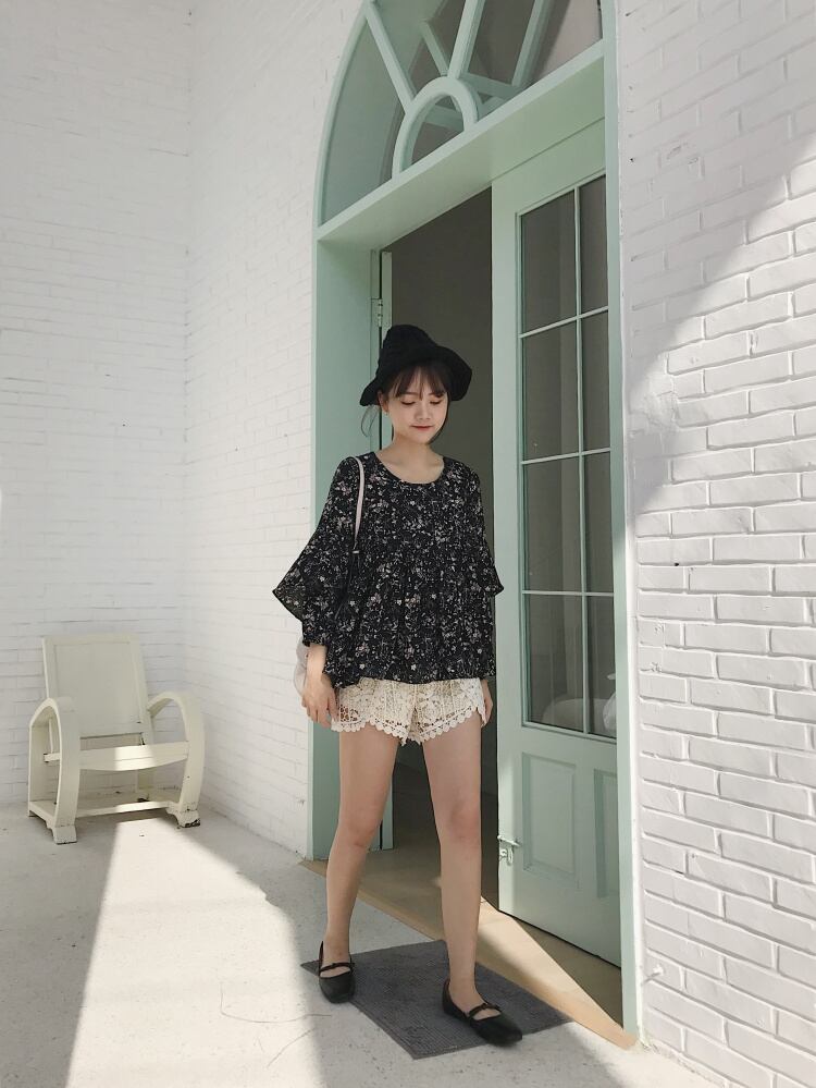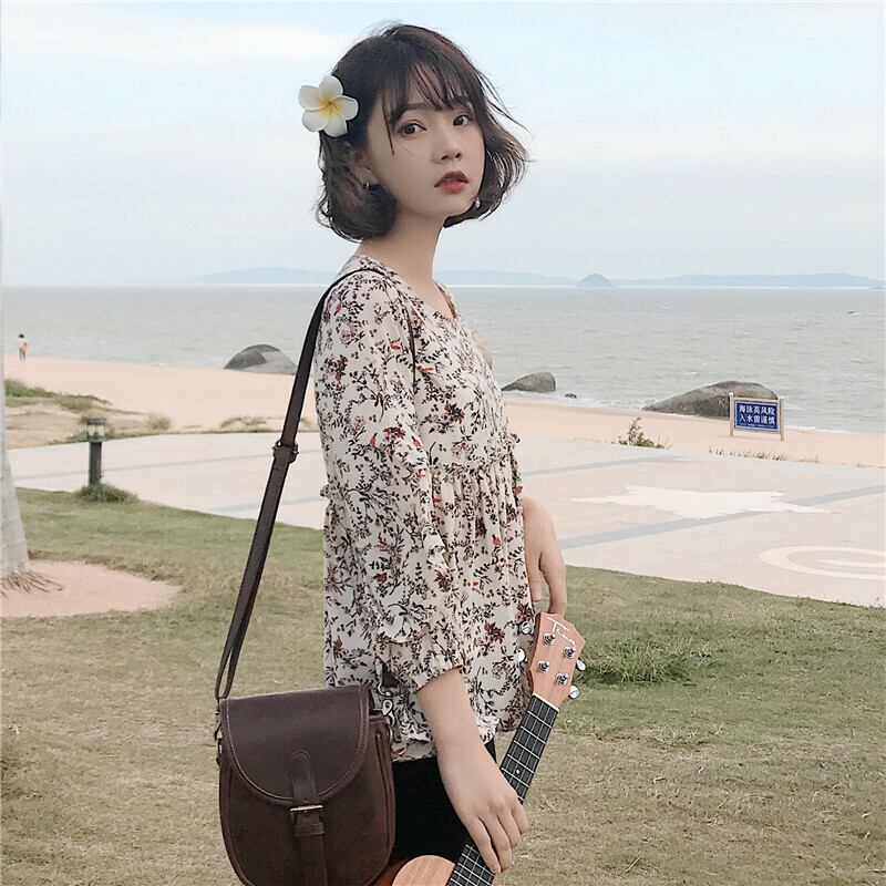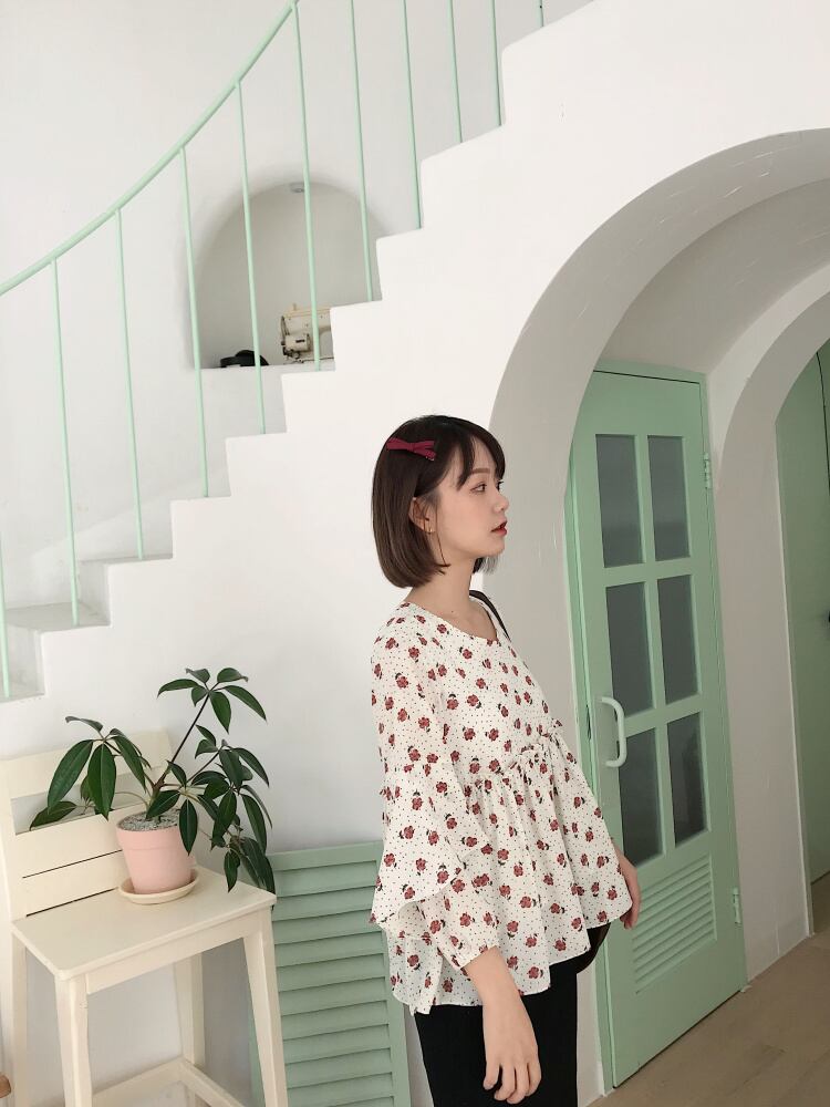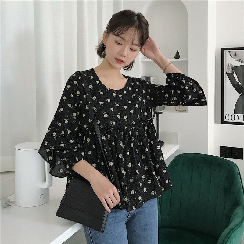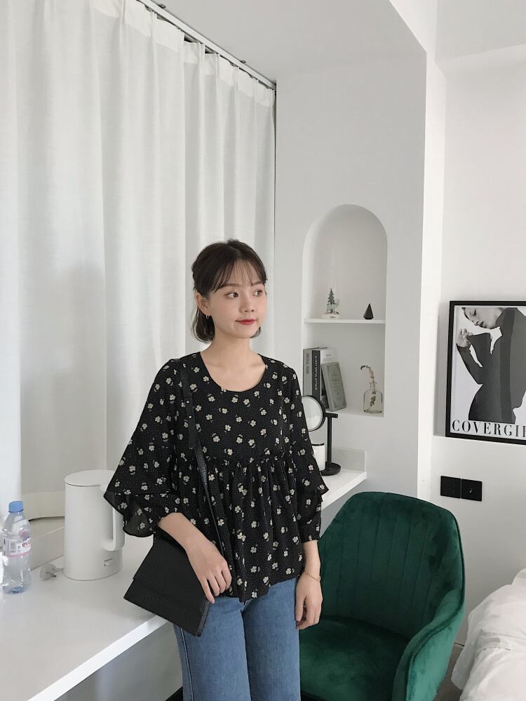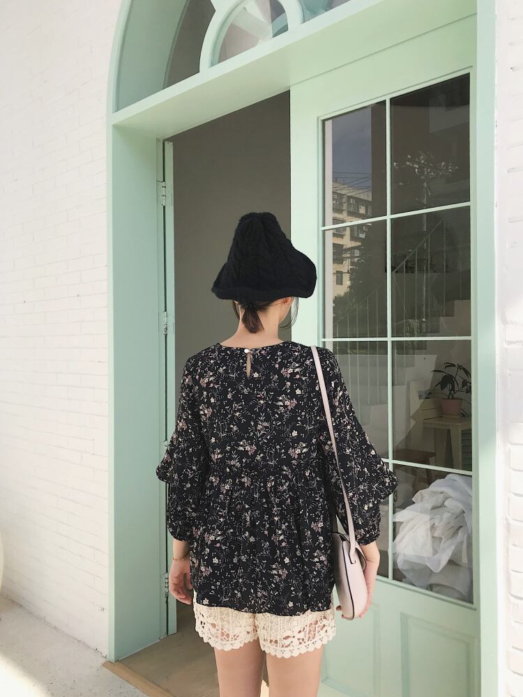 ≪入荷待ち≫ ブラウス シャツ 花柄 フラワー 総柄 ラウンドネック 七分丈 フレア シフォン バルーンスリーブ