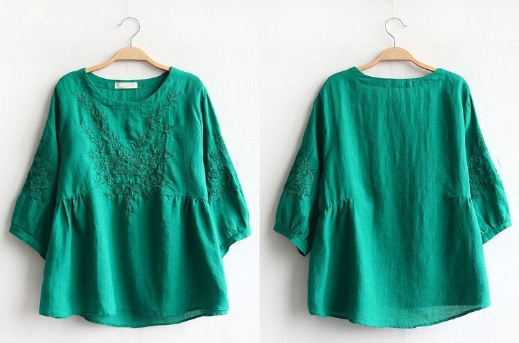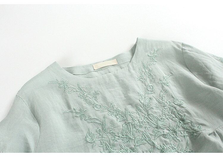 トップス ラウンドネック 七分袖 刺繍 ライトグリーン ホワイト レッド グリーン ワインレッド エスニック カジュアル シンプル