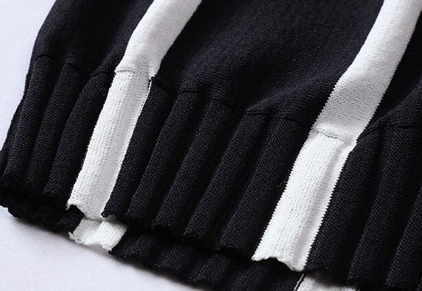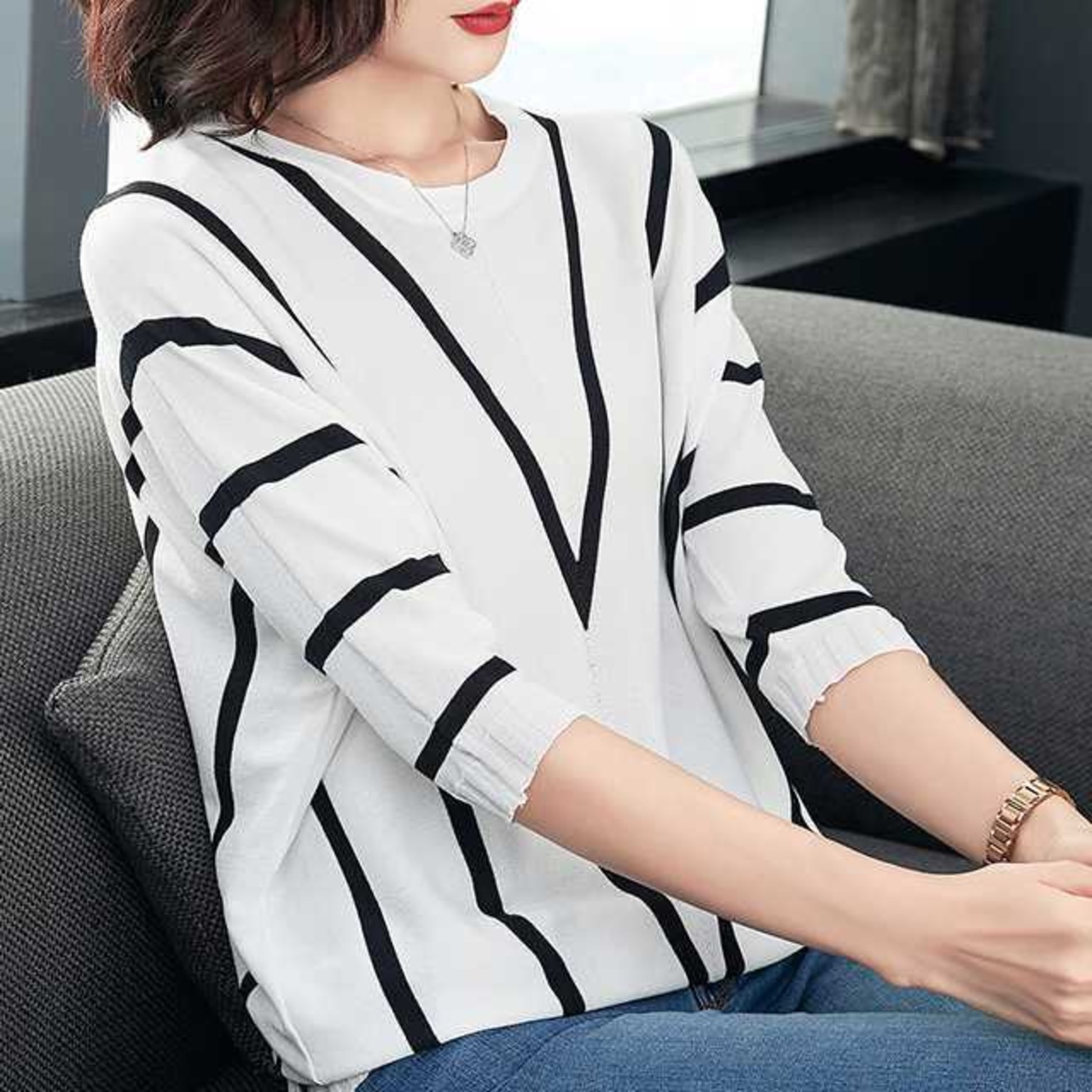 《入荷待ち》トップス ニット ラウンドネック 七分袖 ライン柄 大きいサイズ ホワイト ブラック カジュアル こなれ感 シンプル
