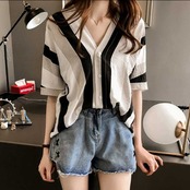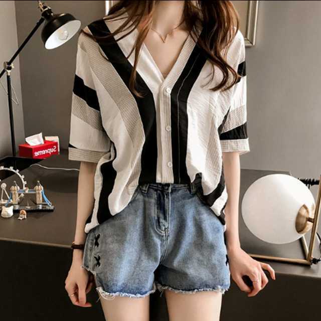 カジュアル シャツ ブラウス ストライプ Vネック 半袖 イエロー ブラック 大きいサイズ 女子会