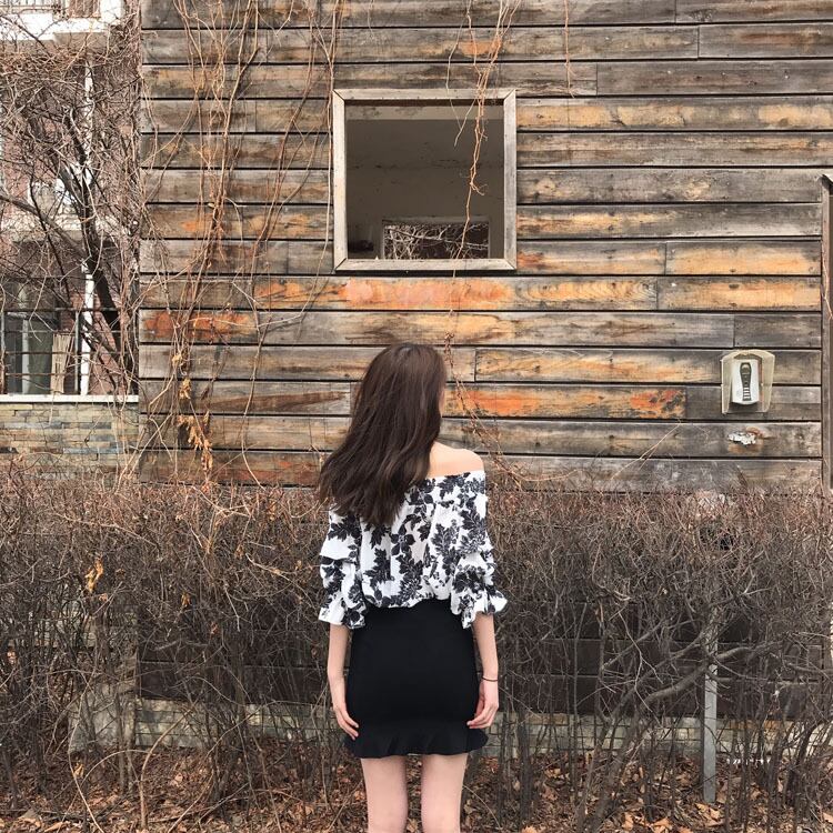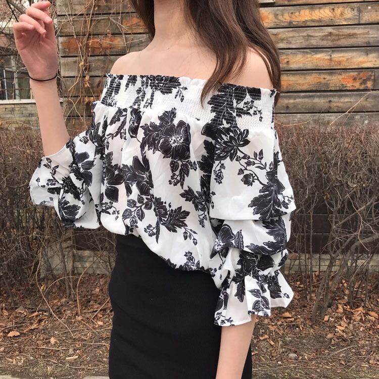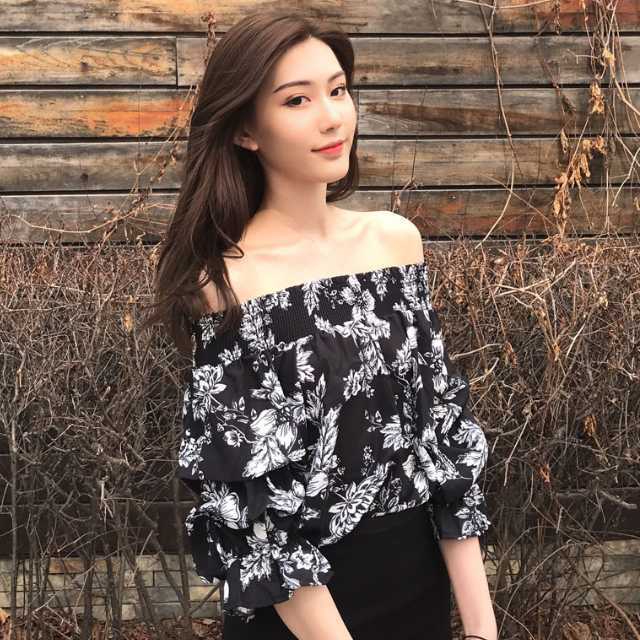 《入荷待ち》レトロ シフォン ブラウス シャツ オフショルダー ワンショルダー ボリューム袖 花柄 ホワイト ブラック 女子会 デート