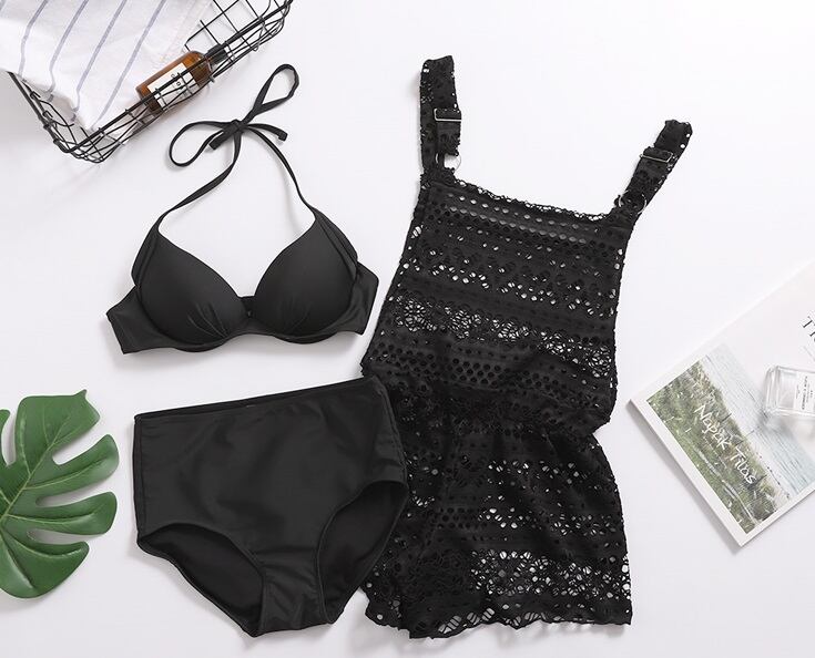 《入荷待ち》水着 ビキニ タンキニ 2WAY 3点セット レース ハイウエスト ブラック 大人可愛い ビーチ リゾート