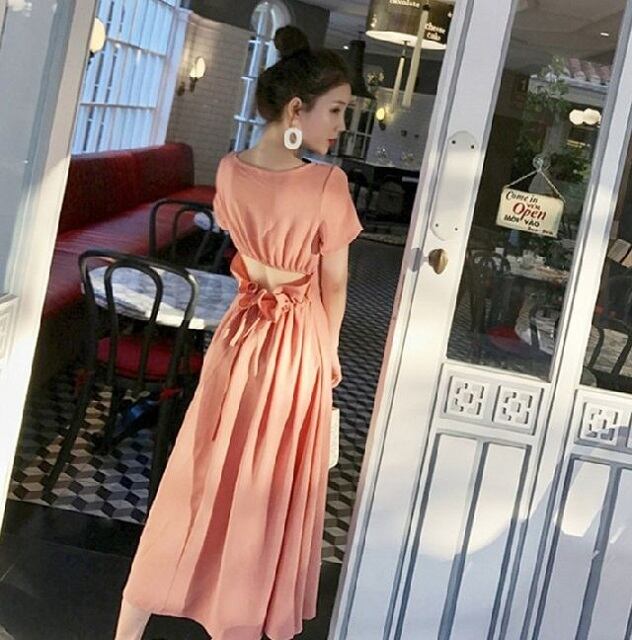 《入荷待ち》バックオープン フェミニンワンピ ミディ丈 半袖 お出掛け 旅行 リゾート デート