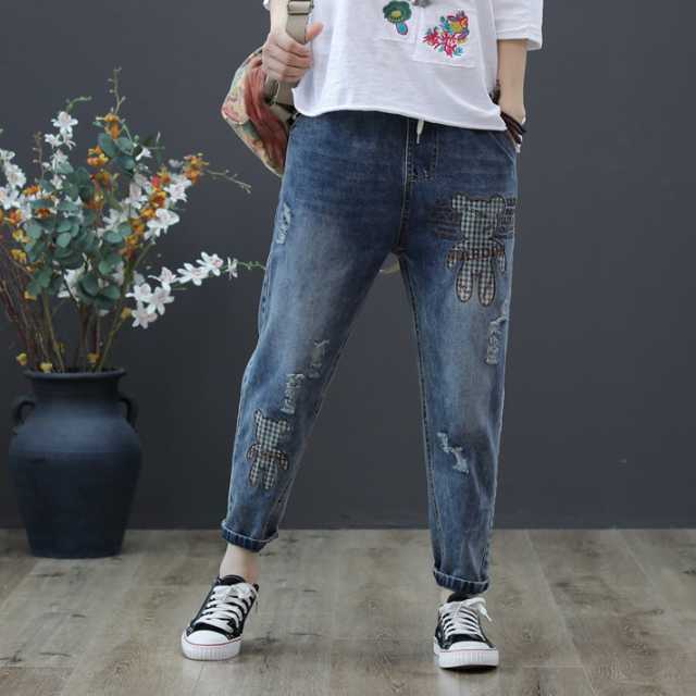 《入荷待ち》パンツ デニム ボーイフレンドデニム 刺繍 ダメージ ブルー カジュアル 大人可愛い こなれ感