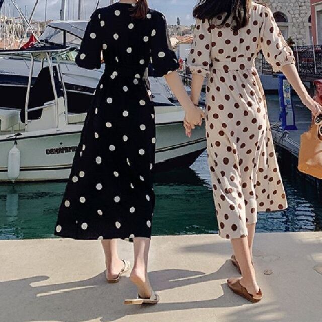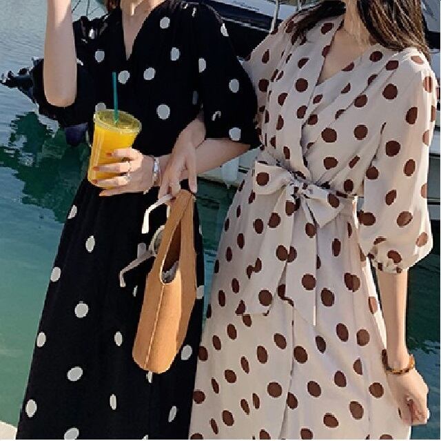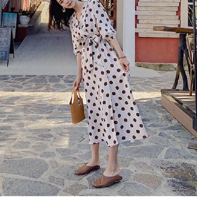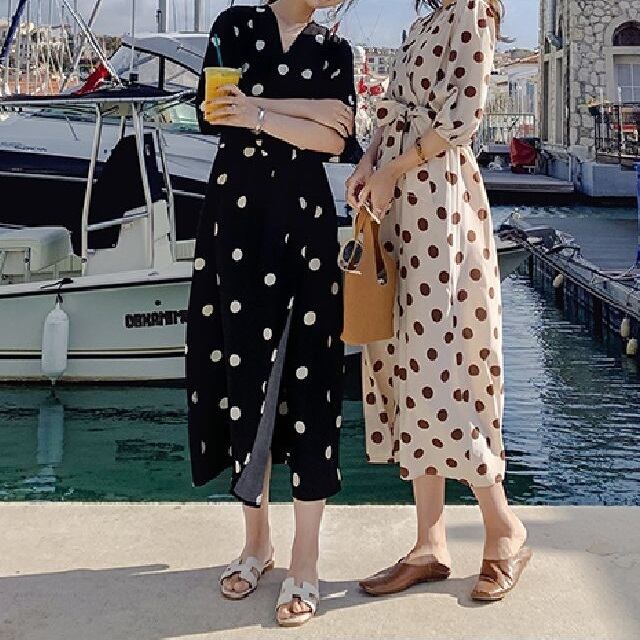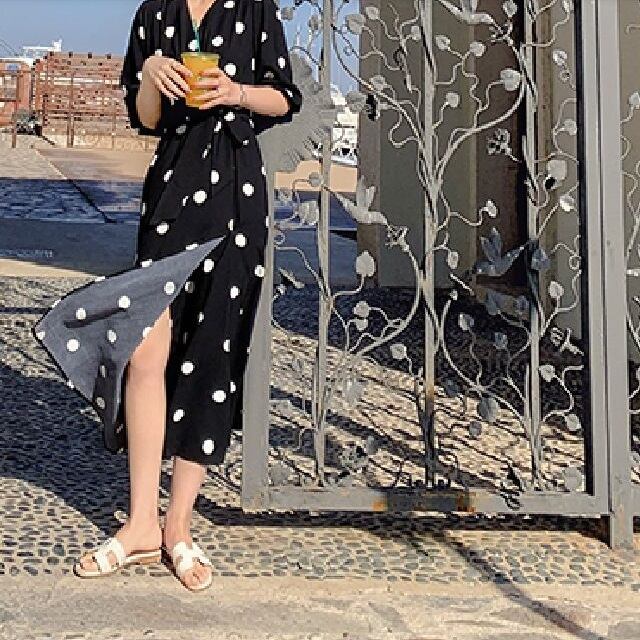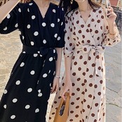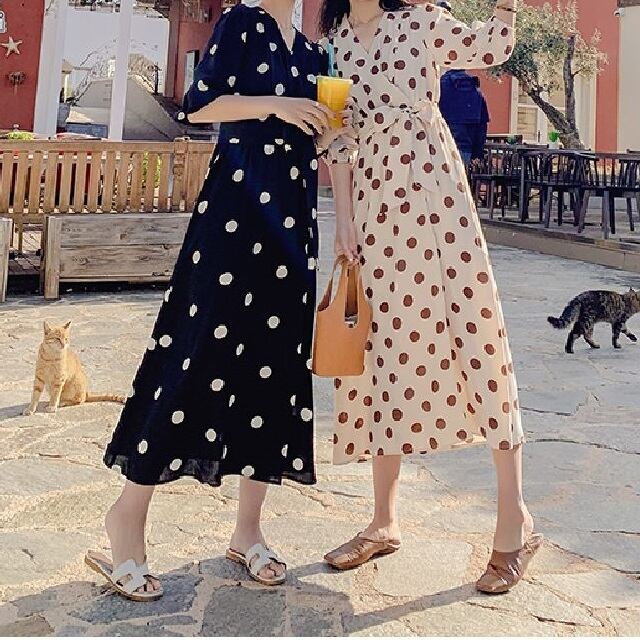 《入荷待ち》ポルカドット柄 Vネック カシュクール ウエストリボン ワンピース お出掛け 旅行 リゾート デート パーティー レトロ