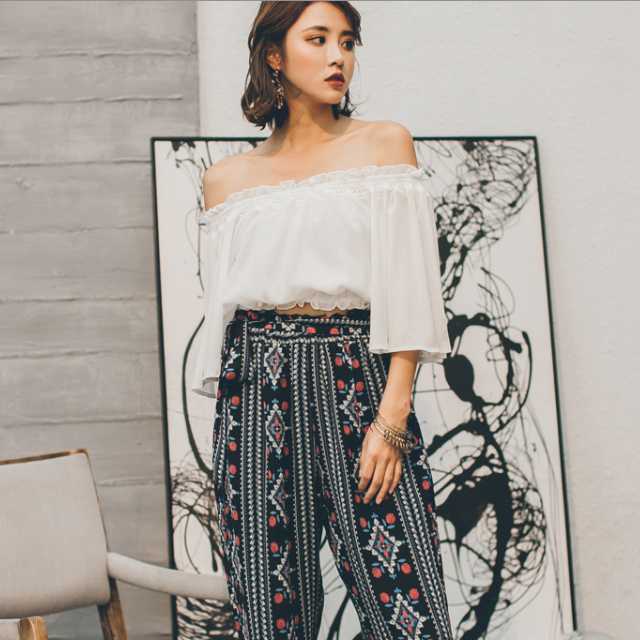 パンツ ワイドパンツ エスニック カジュアル 夏 ネイビー 女子会 デート