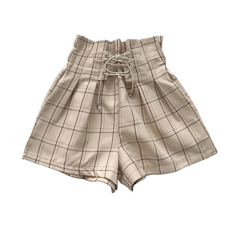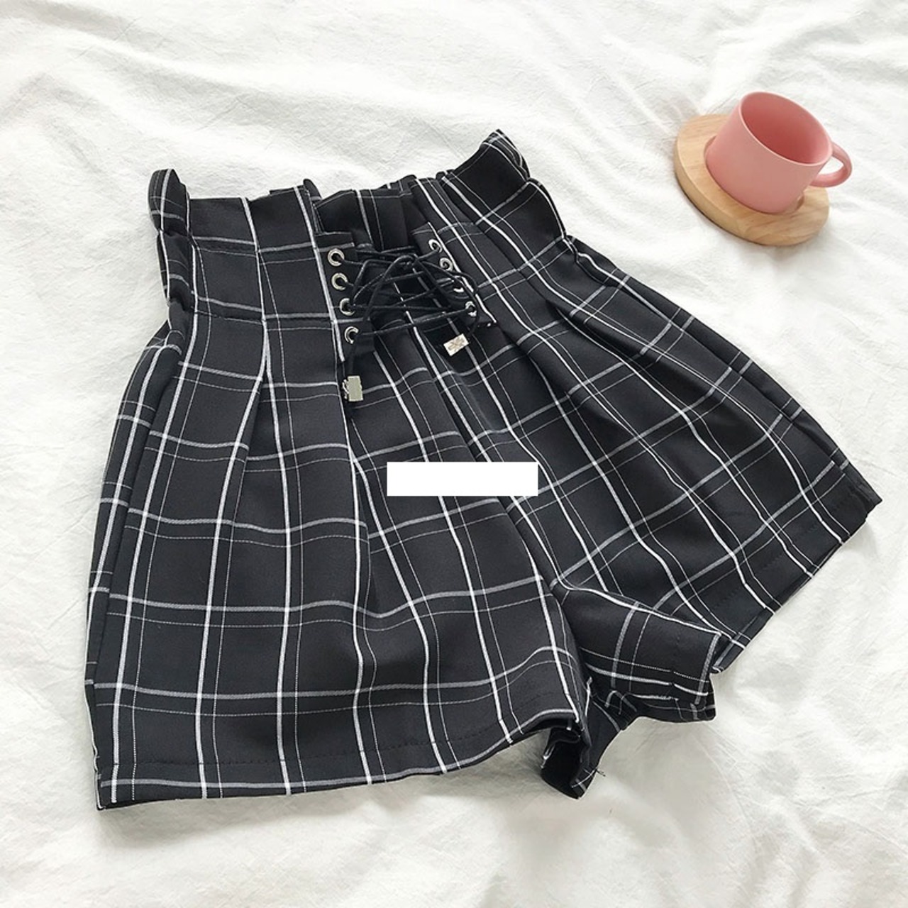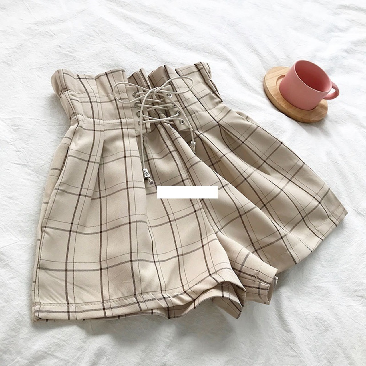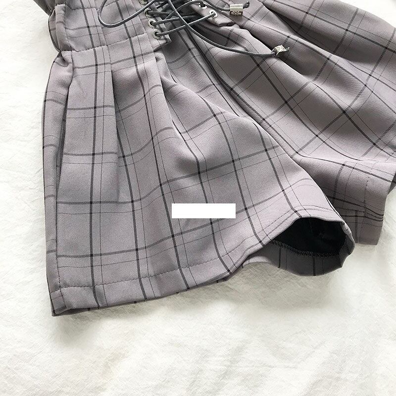 《入荷待ち》パンツ ショートパンツ レースアップ チェック柄 ウィンドウ・ペン グレー ブラック ベージュ 大人可愛い