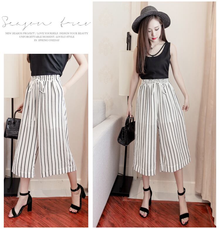 《入荷待ち》ワイドレッグパンツ ミディ丈 ストライプ こなれ ブラック ホワイト ウエストゴム 春 夏