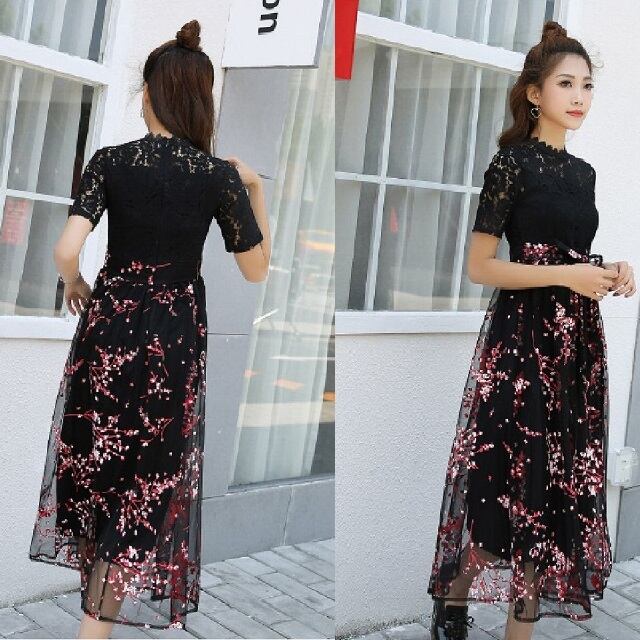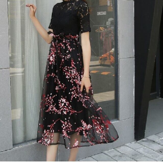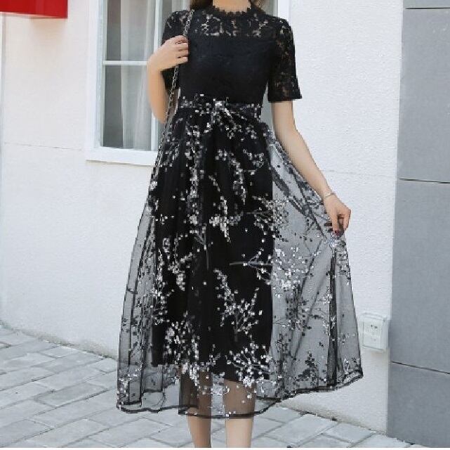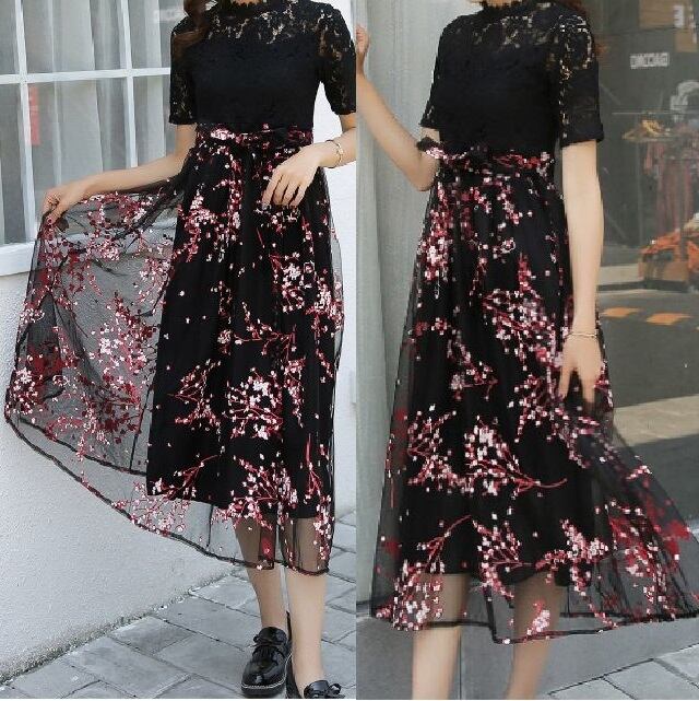 《入荷待ち》ワンピース チュール 透け感 総レース 結婚式 二次会 謝恩会 華やか 半袖 ミディ丈 ミモレ丈