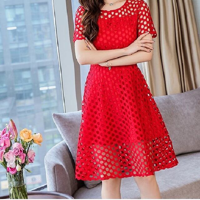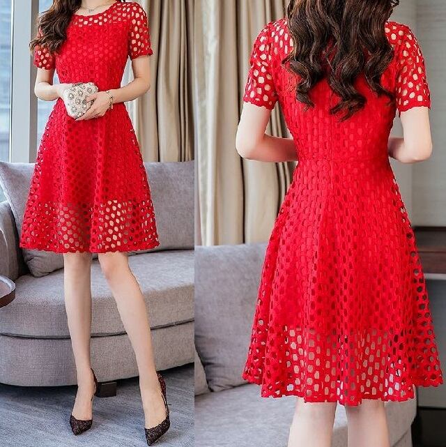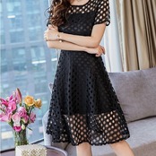大きいサイズ ワンピース フレア メッシュ 透け感 結婚式 二次会 シンプル 大人可愛い 半袖 ラウンドネック 膝丈