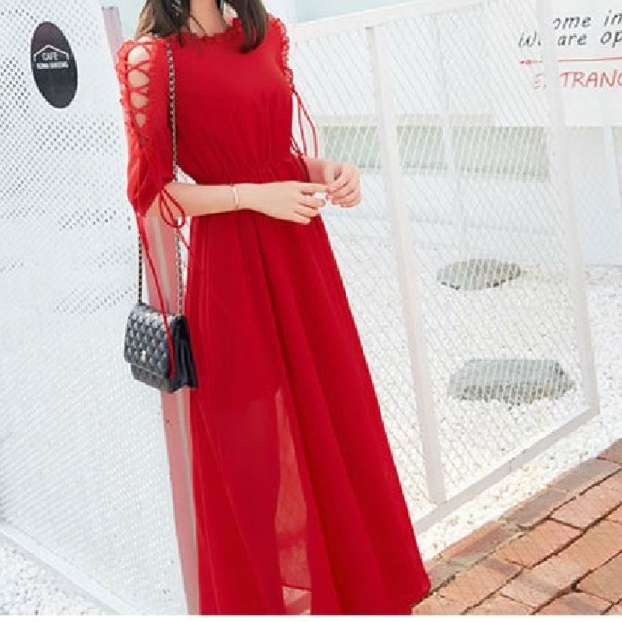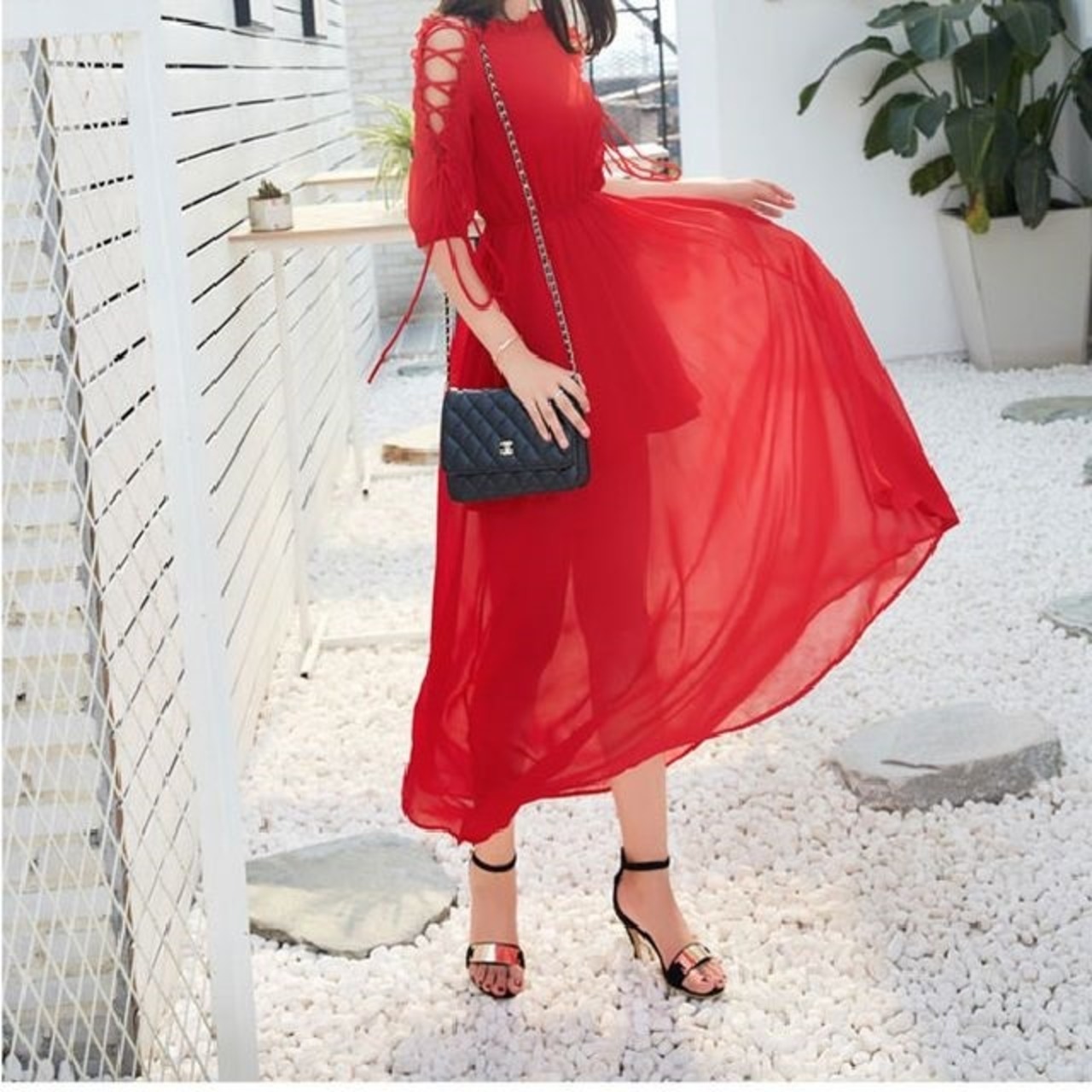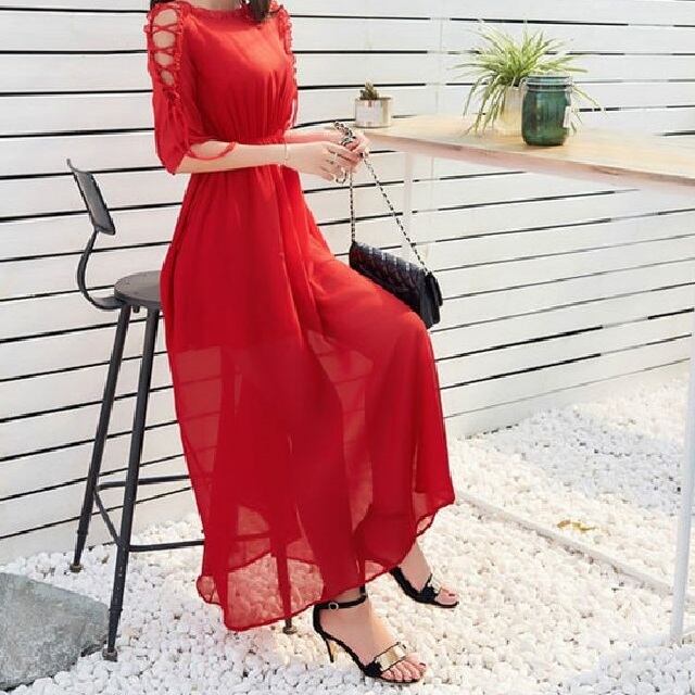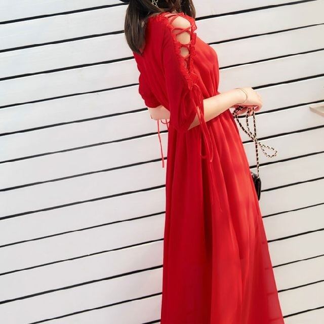 《入荷待ち》ワンピース リゾートドレス レースアップ 編み上げ 五分丈 マキシ丈 透け感 シフォン リボン 大人可愛い