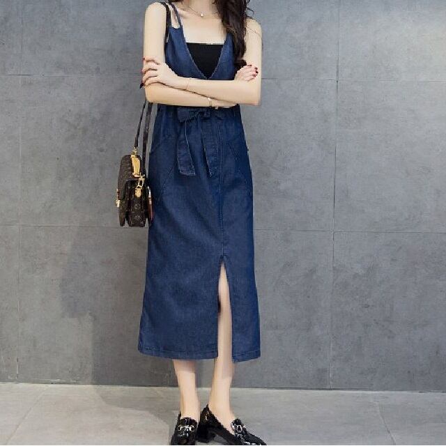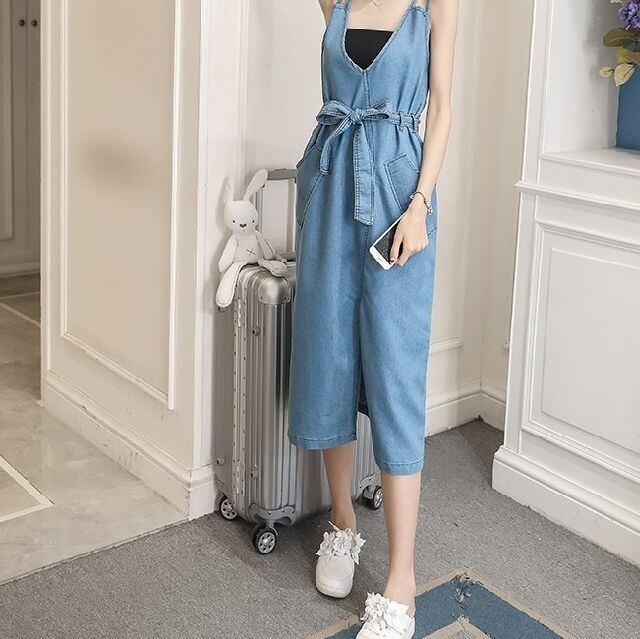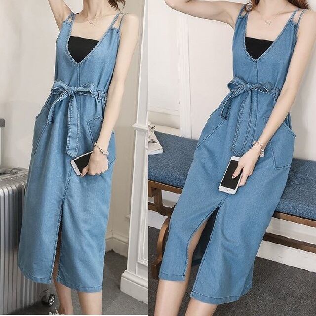 オールインワン ワンピース デニム 大人可愛い カジュアル シンプル ウエストマーク ハイウエスト リボン ベルト ノースリーブ 抜け感 スリット