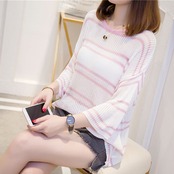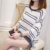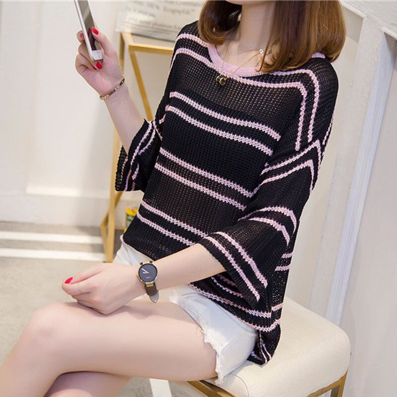 《入荷待ち》トップス ニットプルオーバー 薄手 ボーダー ホワイト ブラック ピンク 七分袖 ラウンドネック 大人可愛い 春 夏