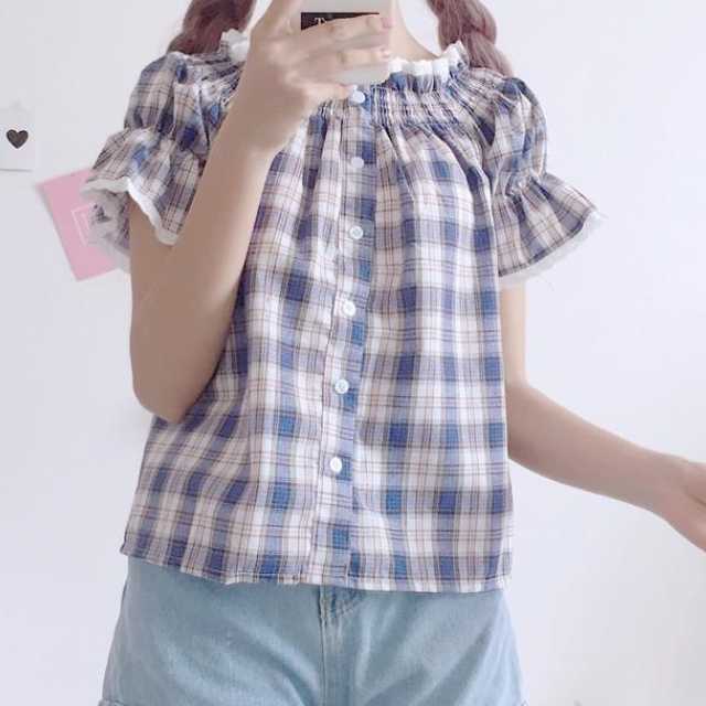 ≪入荷待ち≫ トップス プルオーバーシャツ オフショルダー チェック柄 フリル ピンク ブルー ガーリー 春 夏