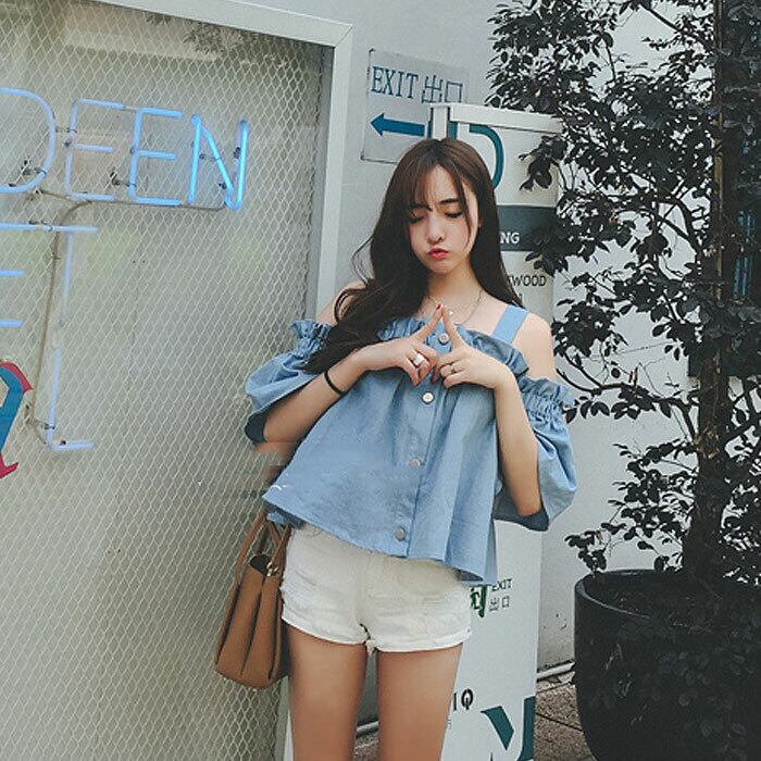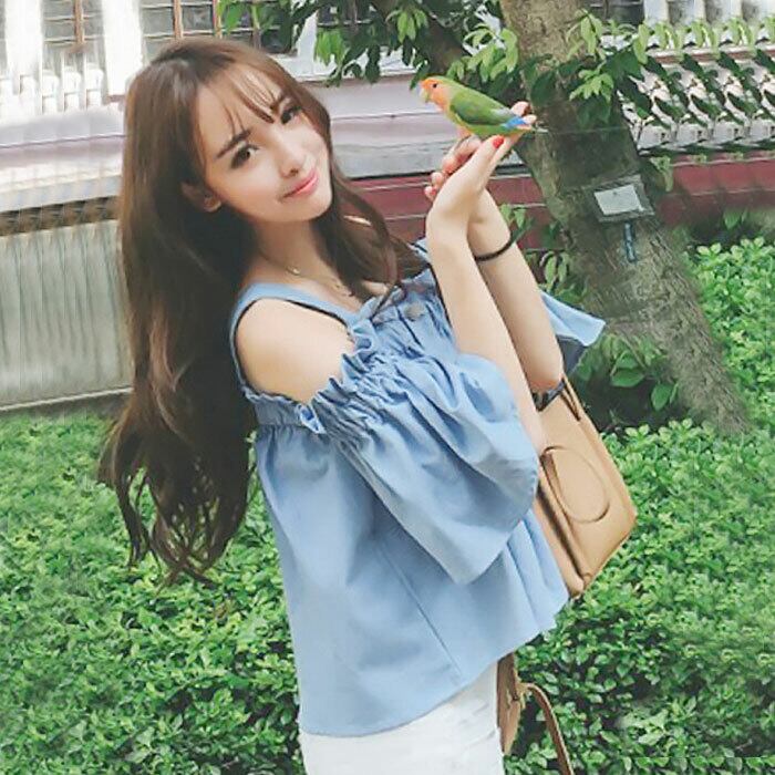 《入荷待ち》トップス プルオーバーシャツ オープンショルダー ブルー 大人可愛い フェミニン 春 夏