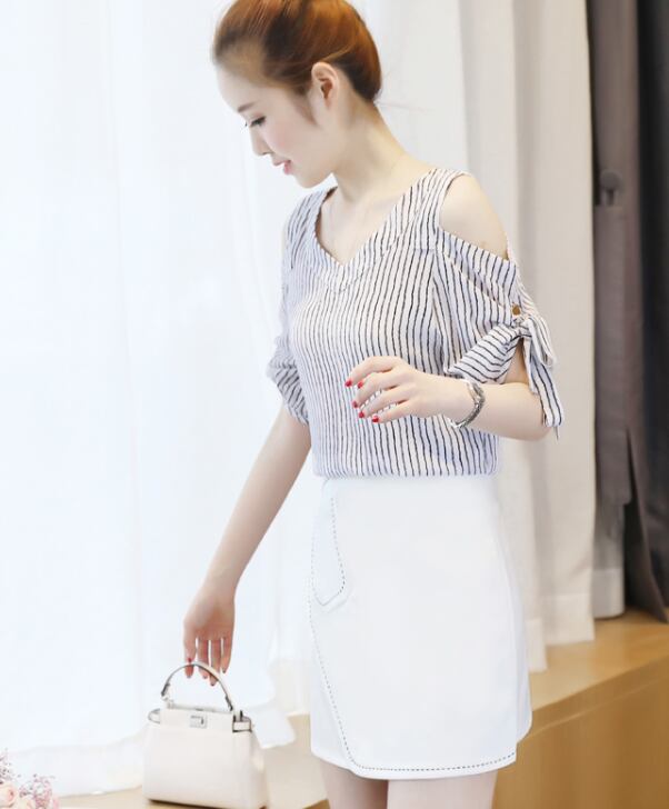 《入荷待ち》オフショルダー トップス カットソー ショルダーカット リボン ストライプ ブラック×ホワイト 半袖