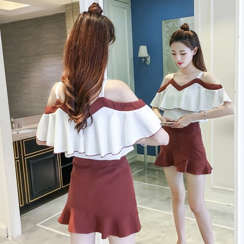 胸元にあしらったフリルとオープンショルダーが大人可愛い印象の1着。