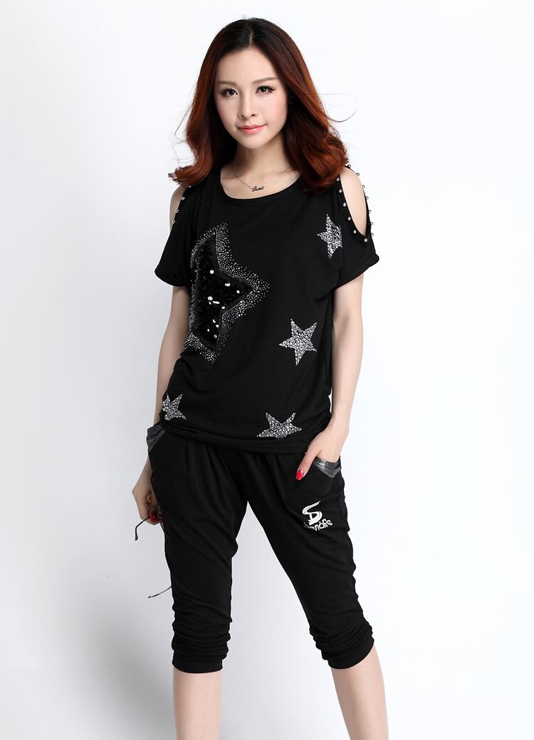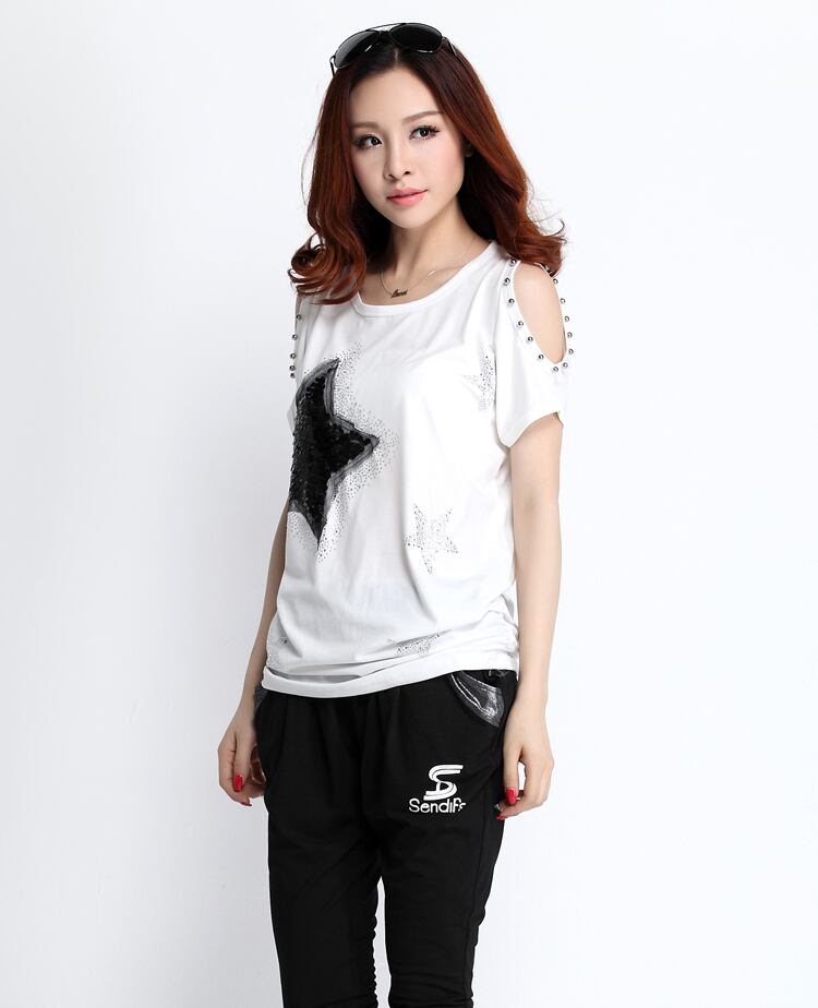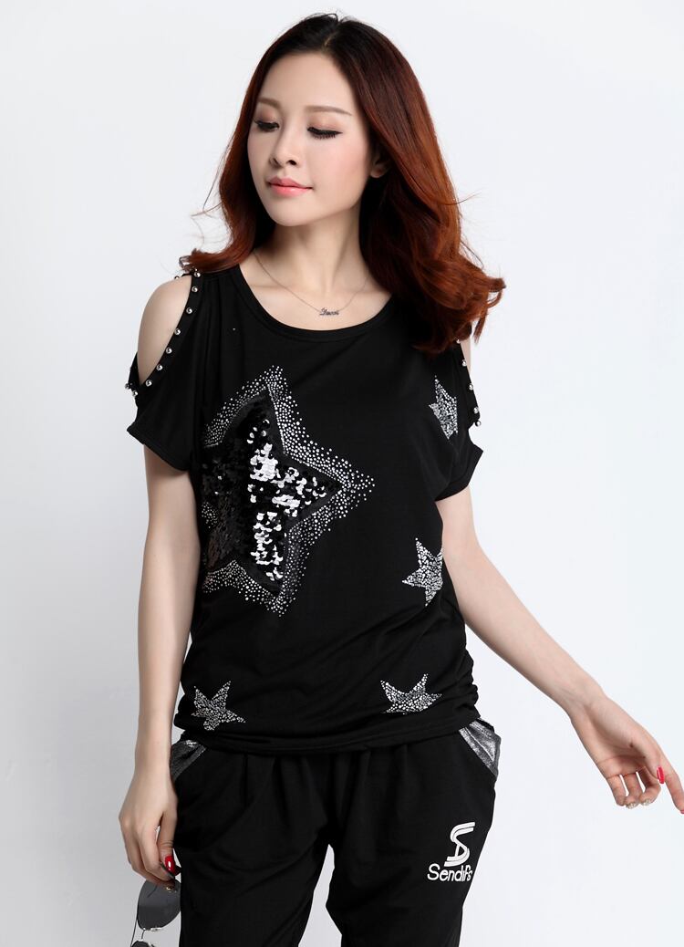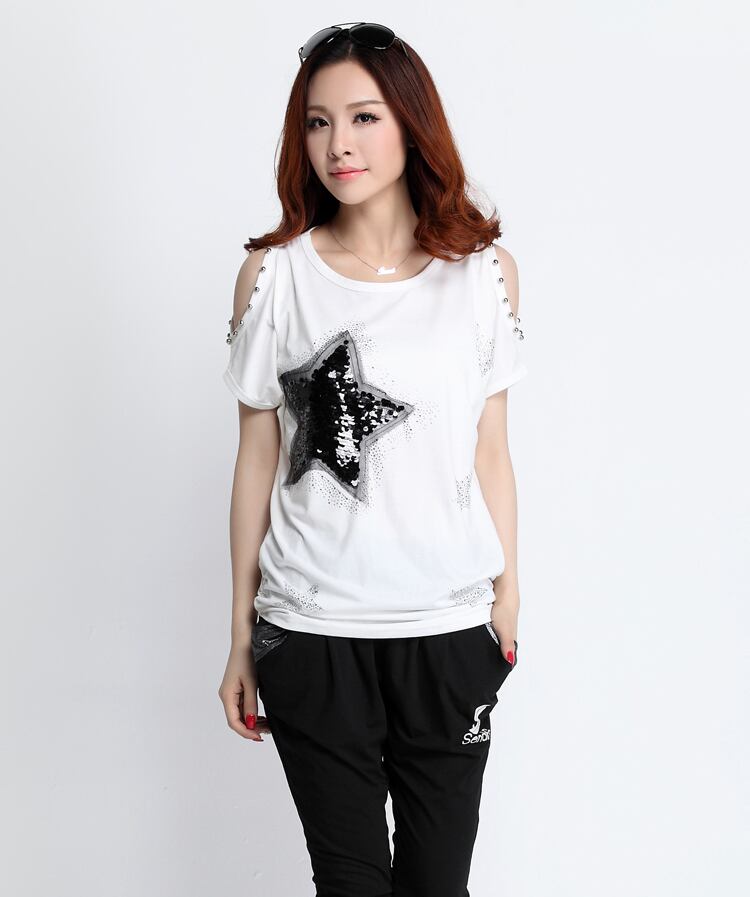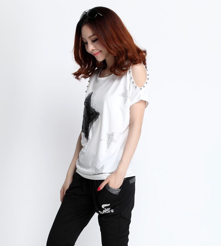 ≪入荷待ち≫ スパンコール ショルダーカット オフショルダー トップス カットソー 星 スター 半袖 夏 モノトーン