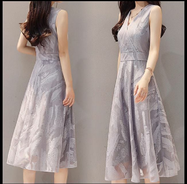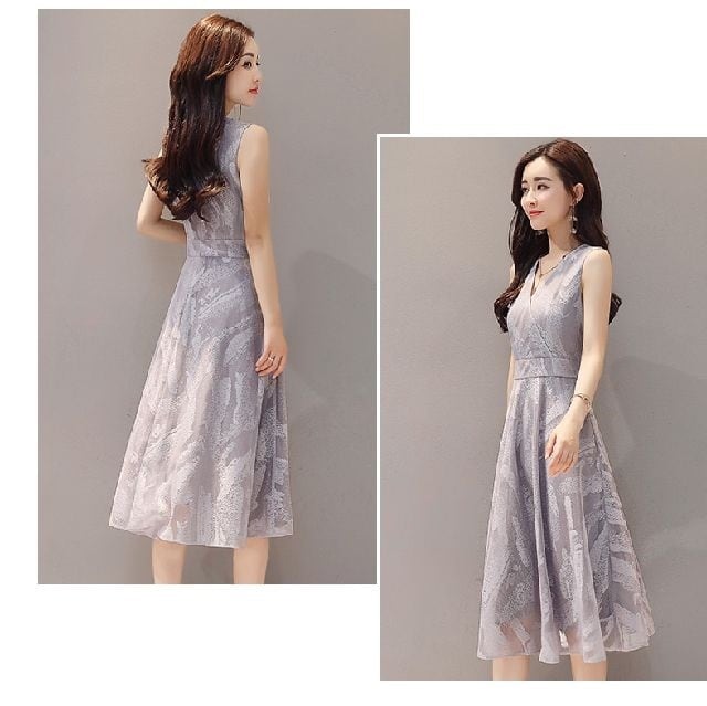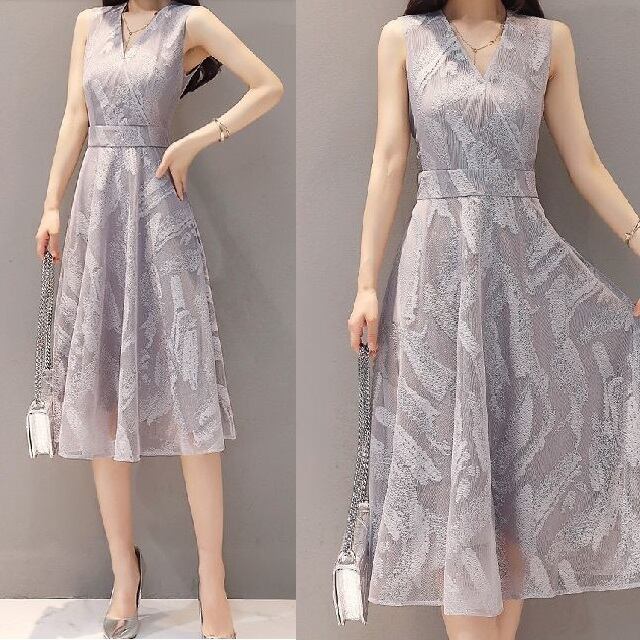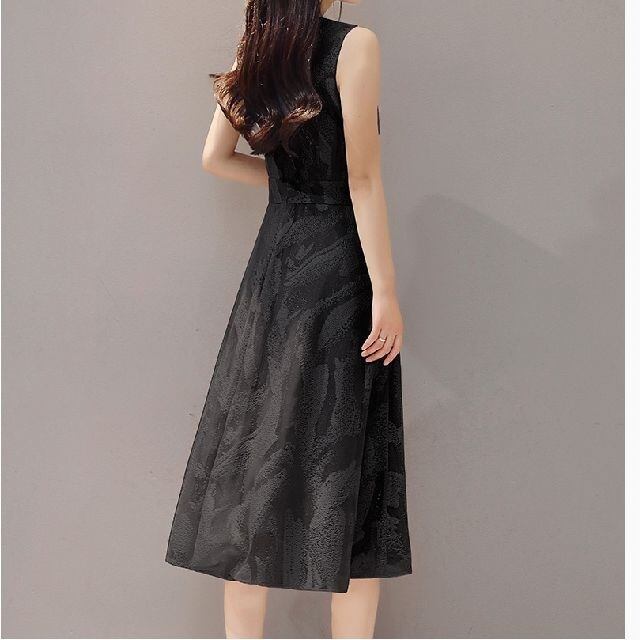 パーティードレス ワンピース ノースリーブ ラウンドネック 膝下 ミディ丈 ミモレ丈 ハイウエスト フレア