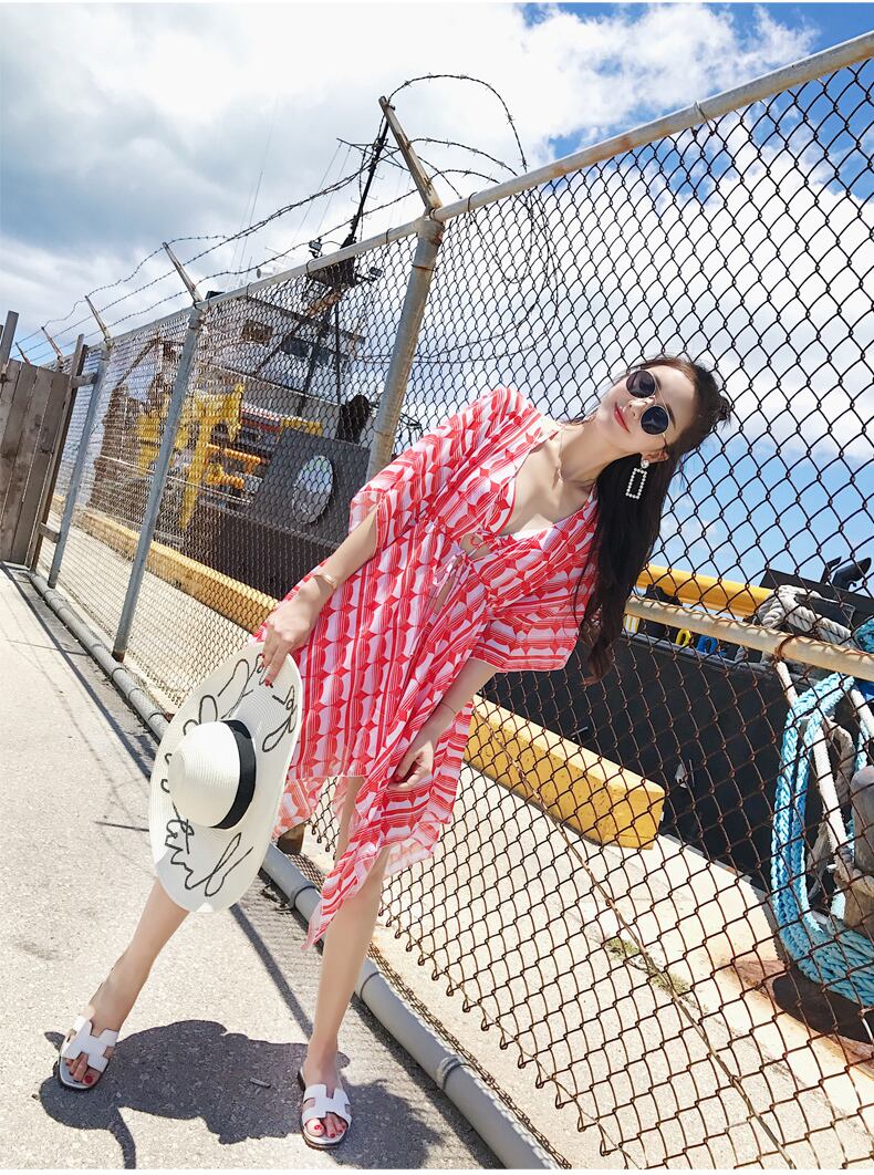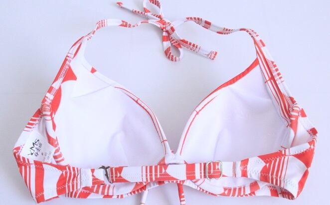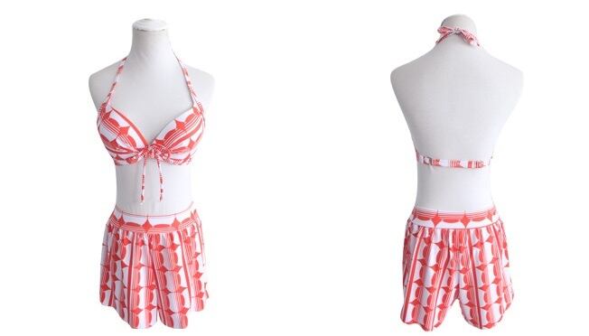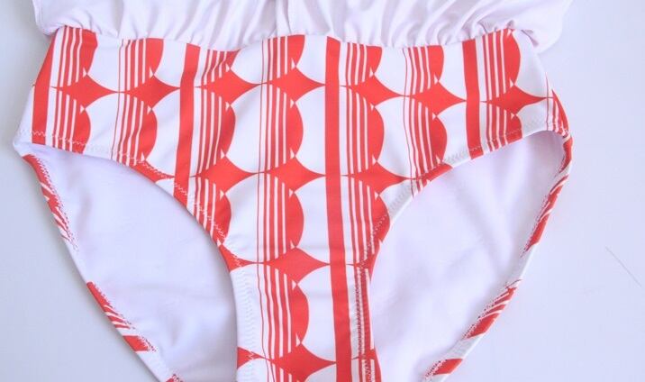 涼しげな柄と華やかな赤色が特徴的な水着です。