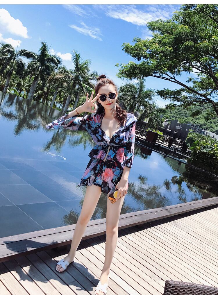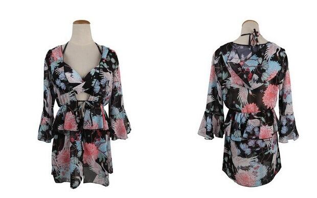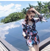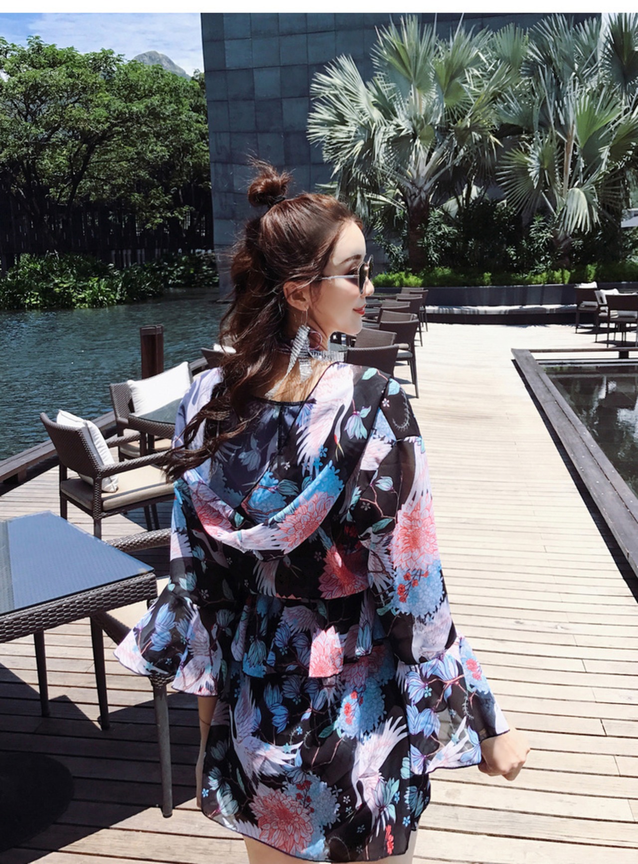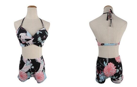 花や鶴のあしらわれた柄が特徴的な水着です。