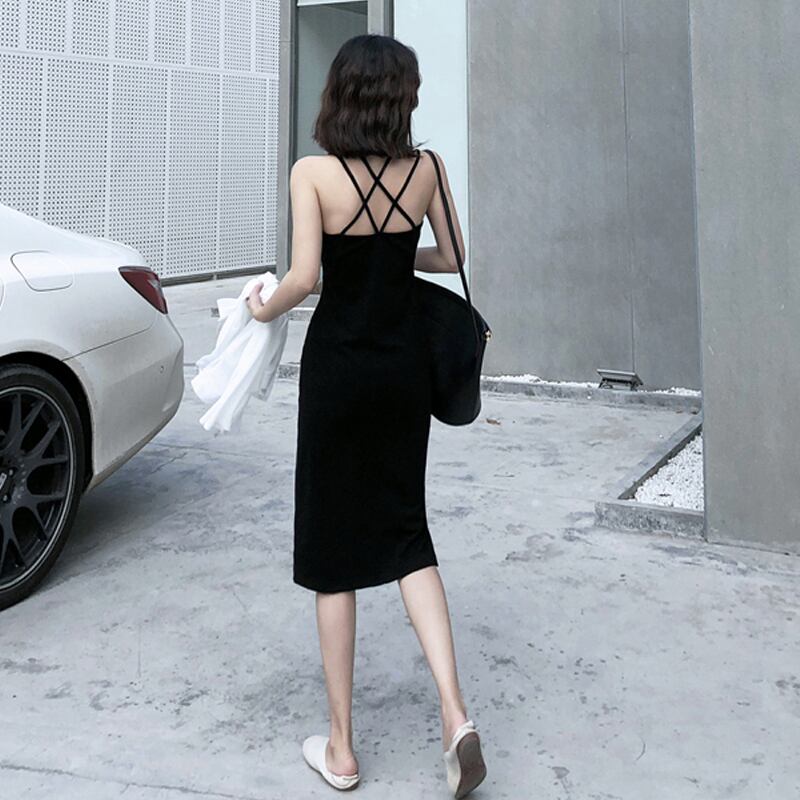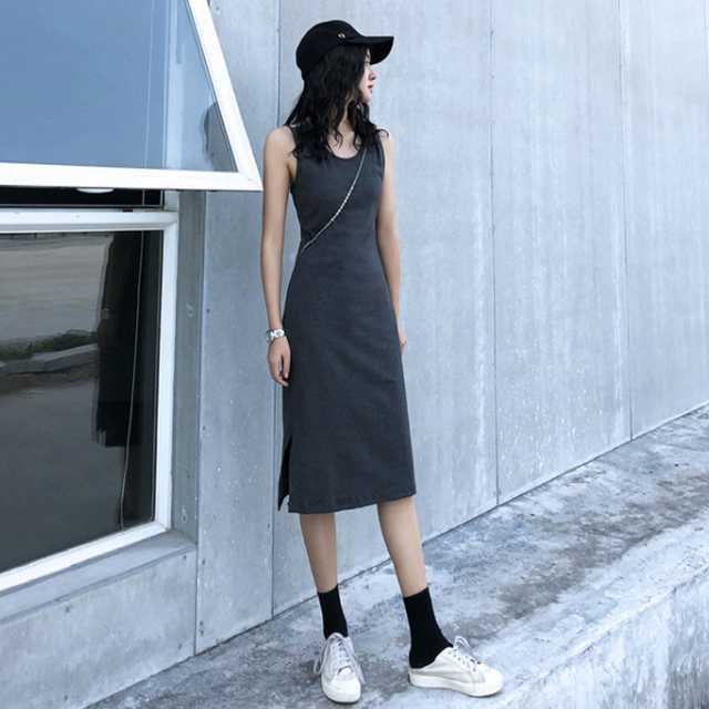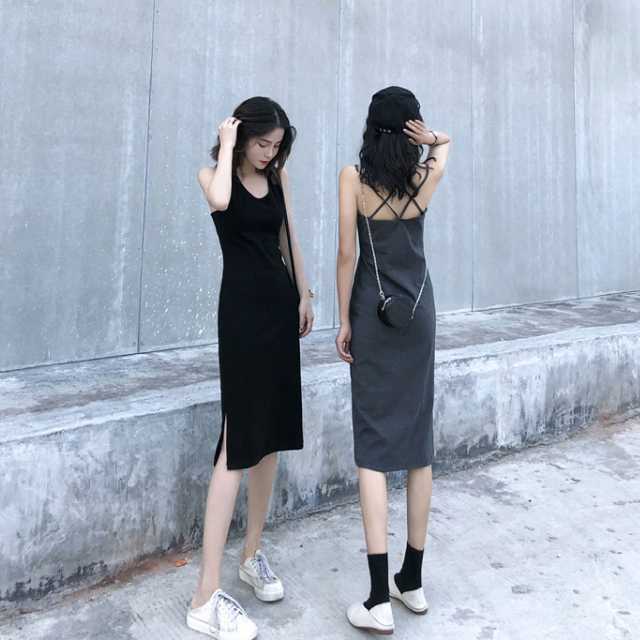 ≪再入荷≫ ワンピース 膝丈 ノースリーブ ベアバック バッククロスストラップ ブラック グレー 大人可愛い カジュアル