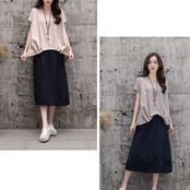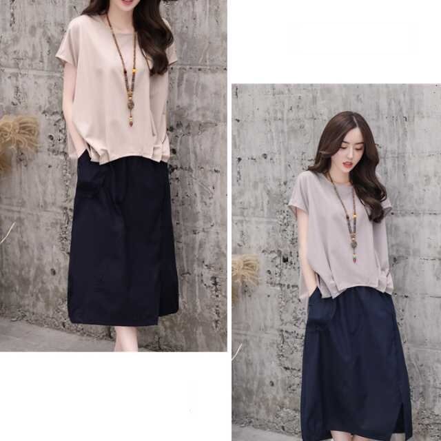 《入荷待ち》セットアップ プルオーバー スカート グレー ベージュ ネイビー 半袖 ひざ下丈 大きいサイズ 大人可愛い シンプル こなれ感