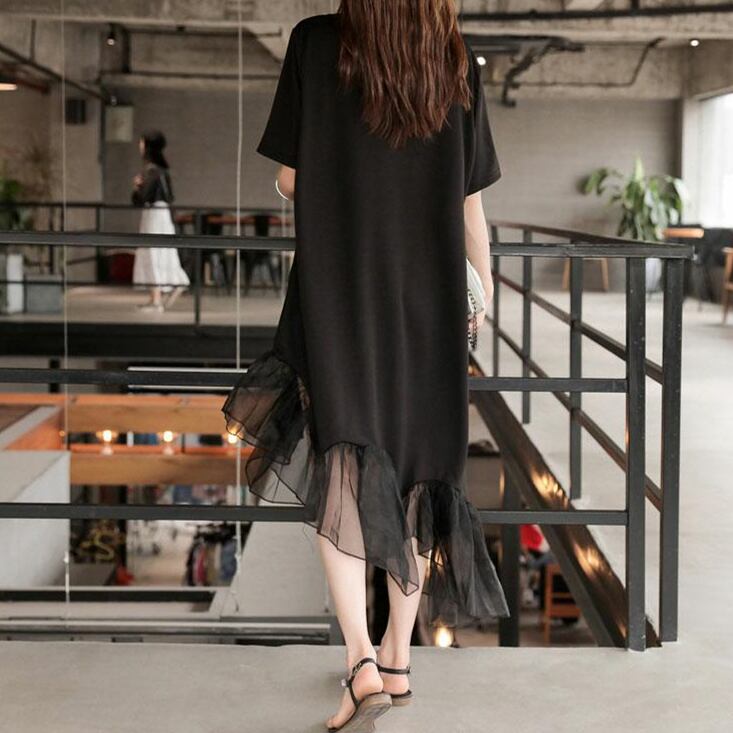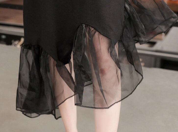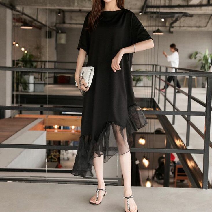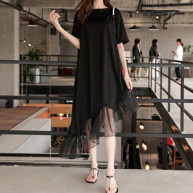 《再入荷》ワンピース 切り替え シースルー 半袖 無地 ブラック 大きいサイズ カジュアル こなれ感 春 夏