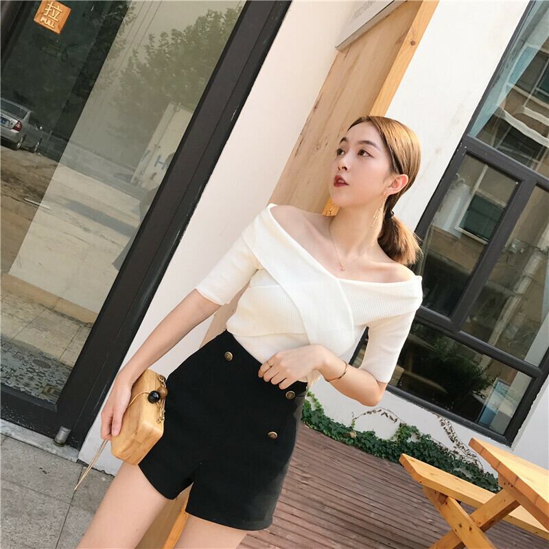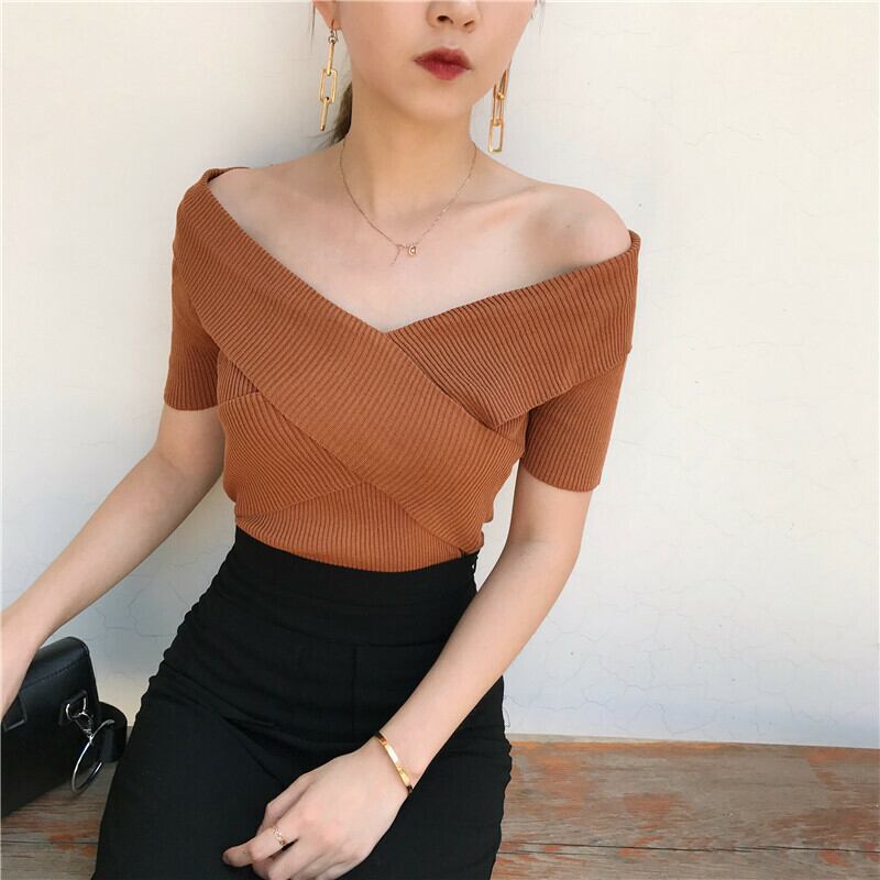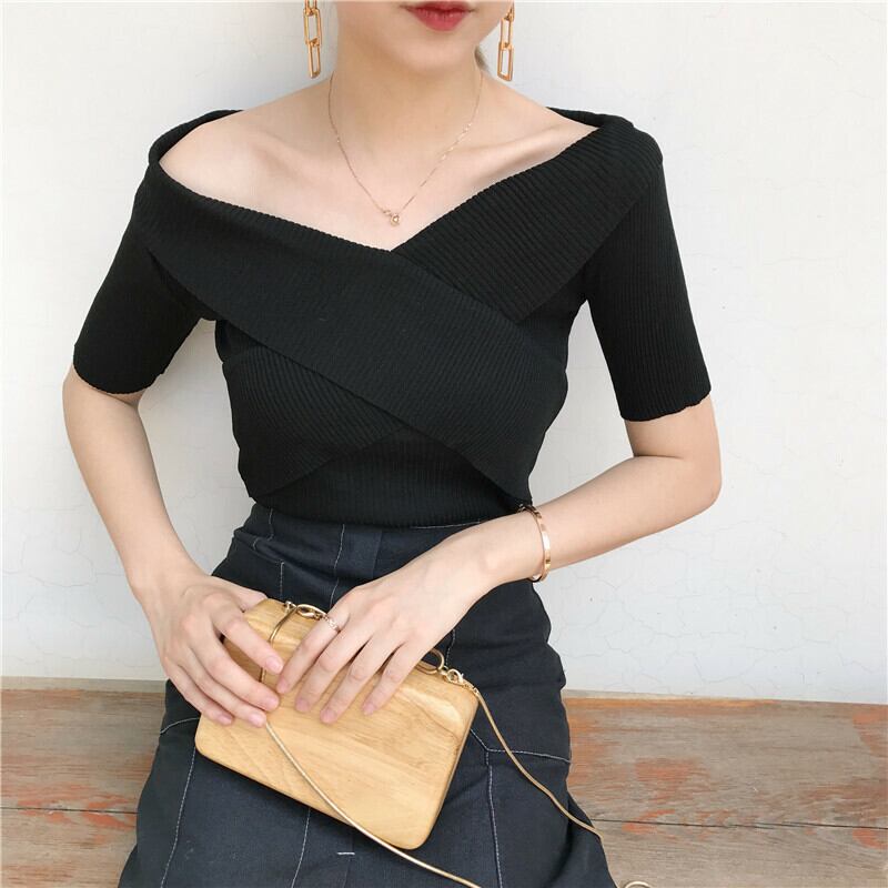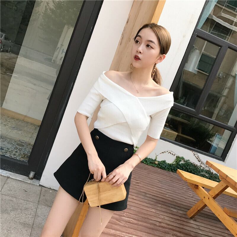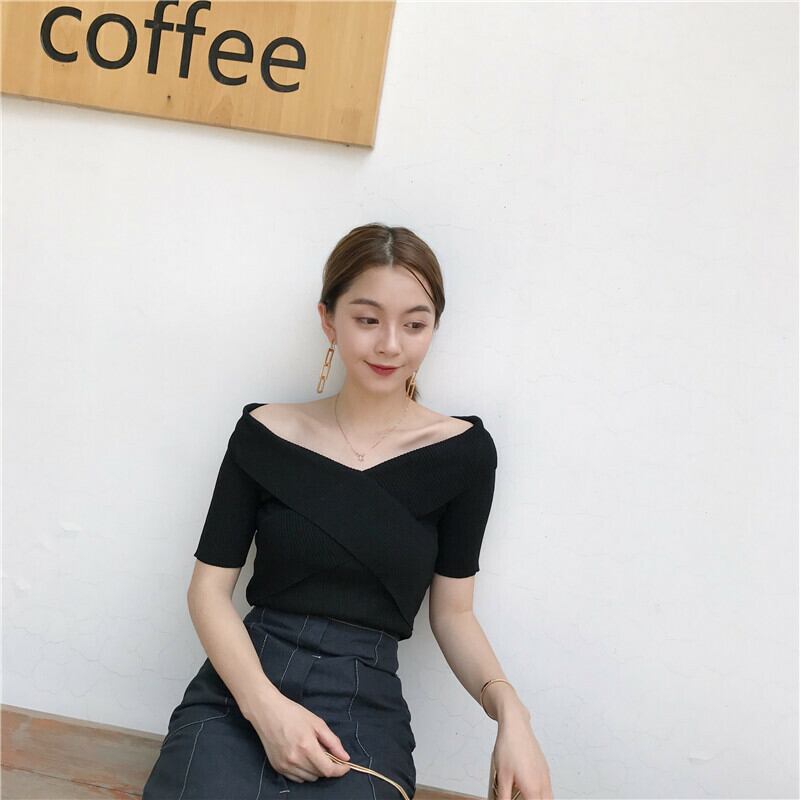 《入荷待ち》サマーニット 半袖 トップス カットソー オフショルダー ワンショルダー 春 夏 フロントクロス タイト 20代 30代
