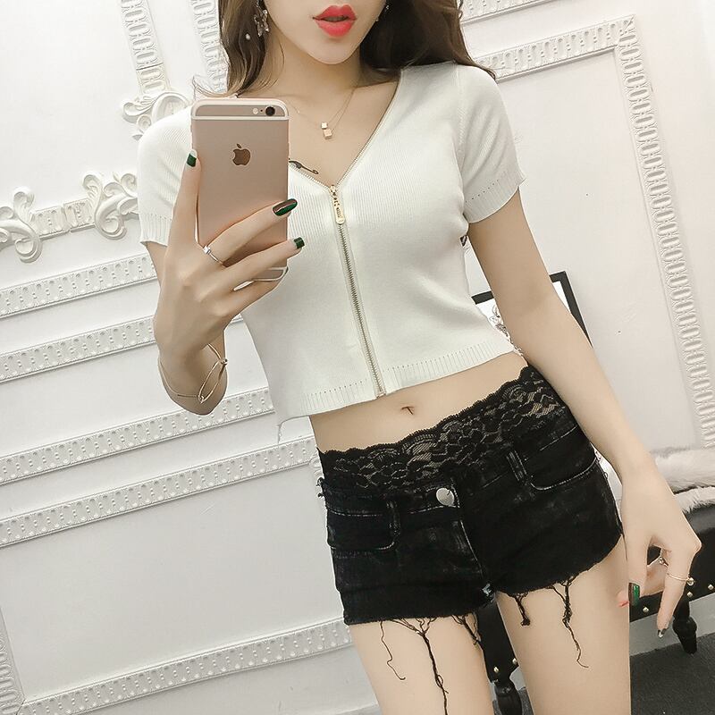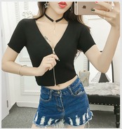 《入荷待ち》Vネック トップス カットソー フルジップ ジップアップ ショート丈 セクシー シンプル ハイウエスト ブラック ホワイト