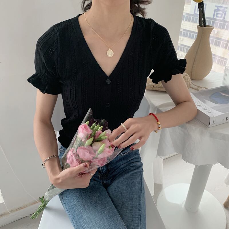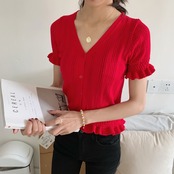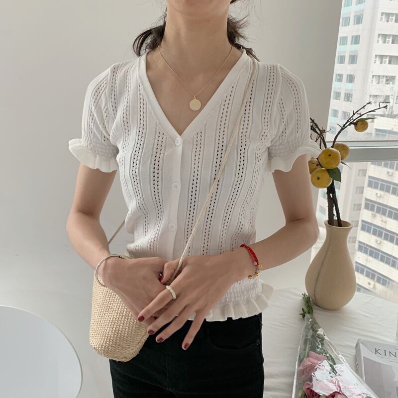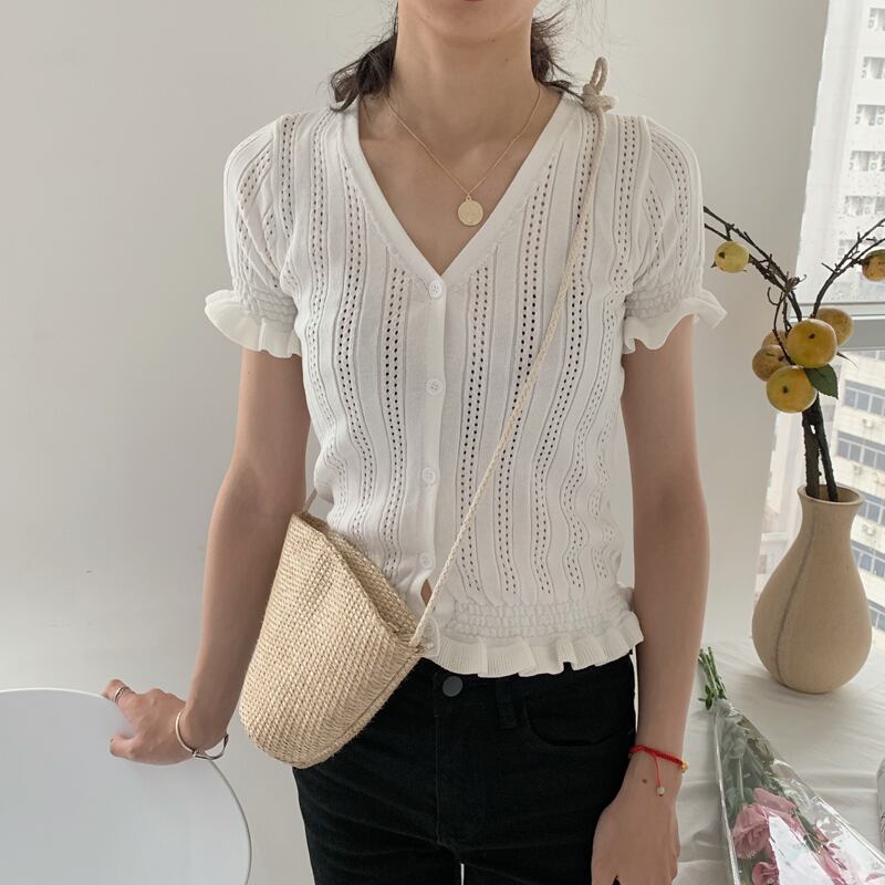 ≪入荷待ち≫ サマーニット トップス カットソー カーディガン 半袖 フリル パフスリーブ Vネック 春 夏