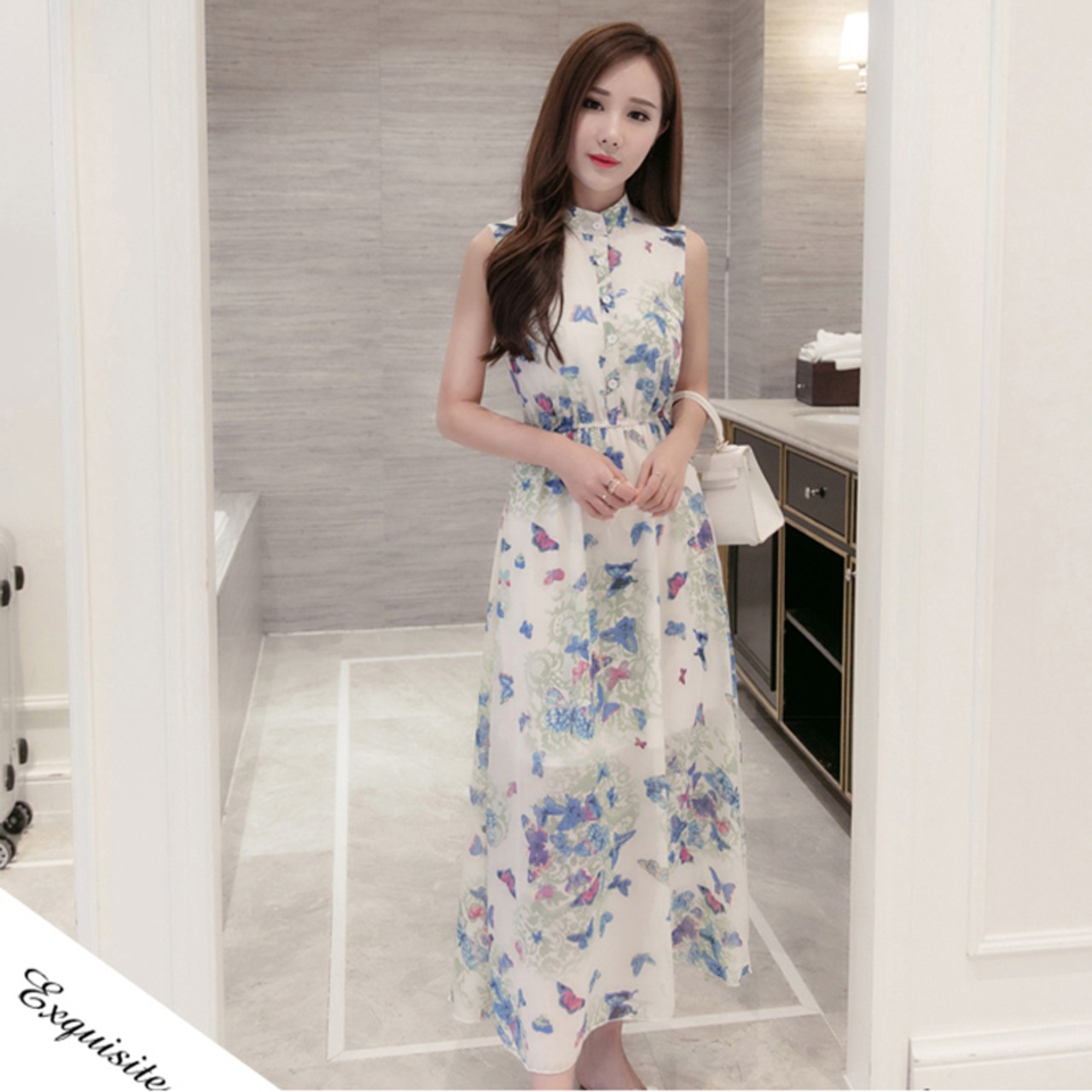 《入荷待ち》シフォン ワンピース ノースリーブ ロング丈 ミディ丈 お呼ばれ フラワー 蝶 バタフライ ピンク ブルー お呼ばれ デート