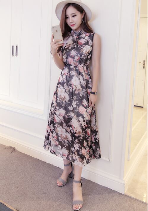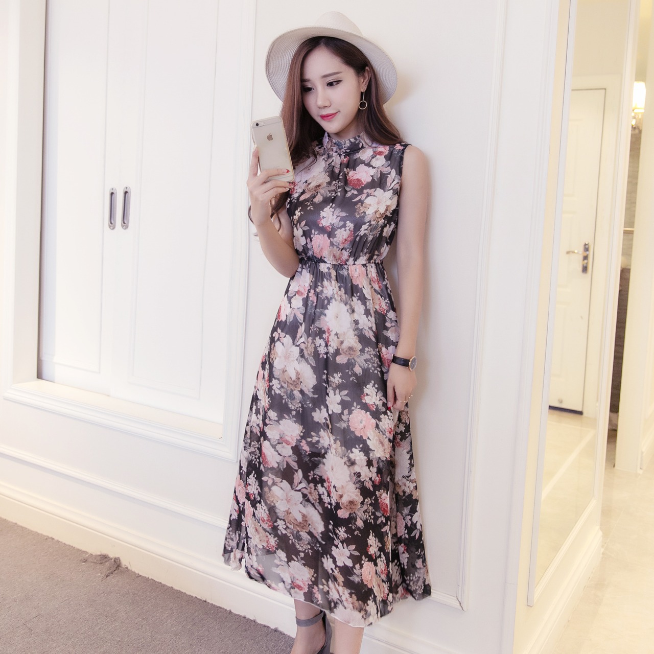 《入荷待ち》ワンピース シフォン お呼ばれ デート フラワー 透け感 ハイネック ノースリーブ ハイウエスト 切り替え ウエストゴム