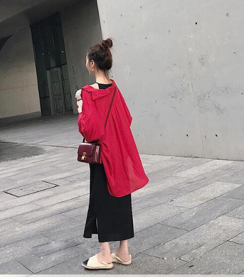 鮮やかなレッド×ブラックの、パキっとした色合いが可愛いシャツとワンピースのセットアップです。
