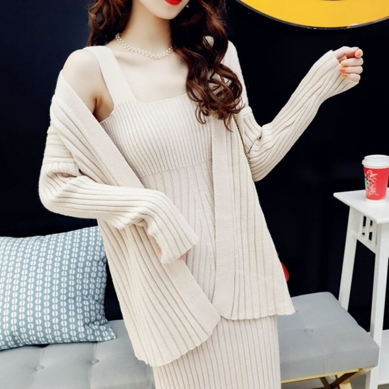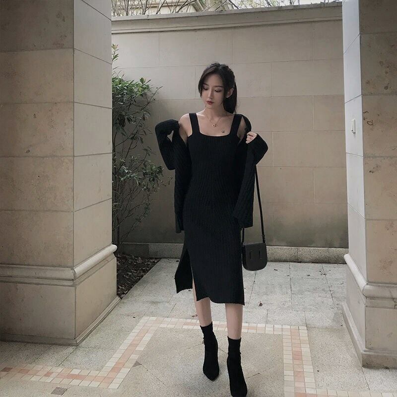 《再入荷》セットアップ ツーピース サマーニット リブニット 長袖 カーディガン ノースリーブ ワンピース タイト スクエアネック スリット