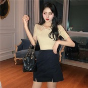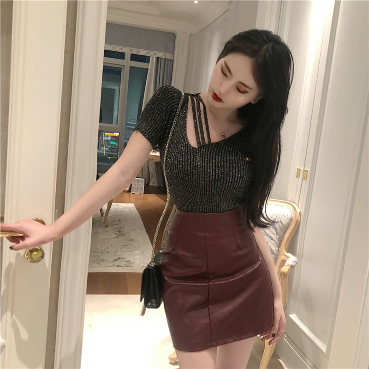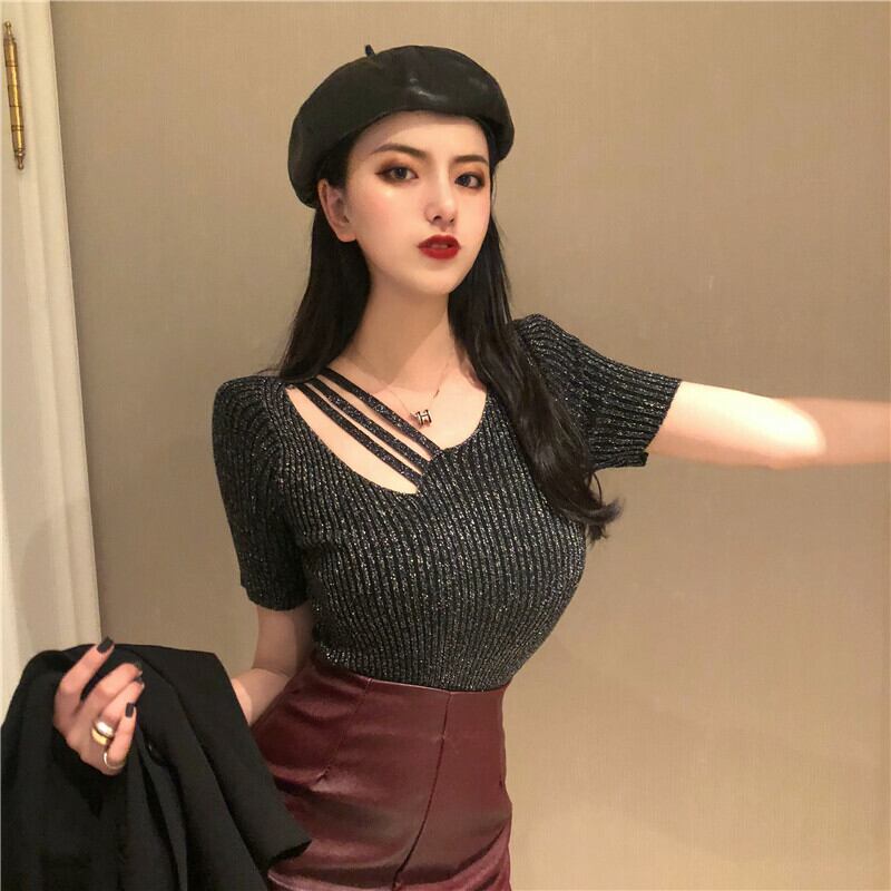 《入荷待ち》サマーニット トップス カットソー ラメ セクシー Vネック 半袖 リブ 大人女子 キレイめ ブラック ベージュ