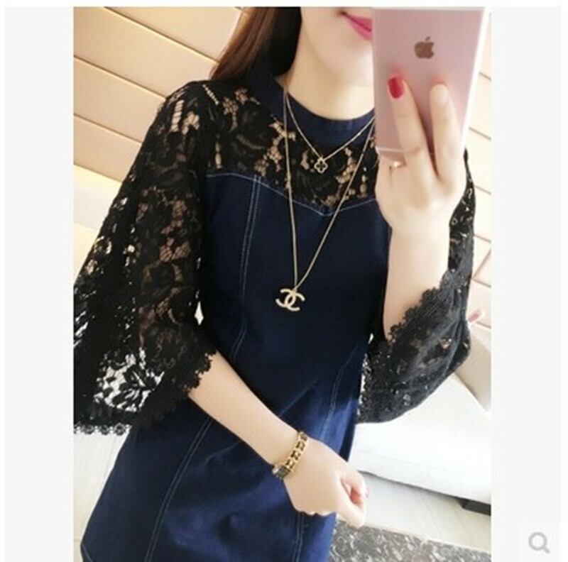 《入荷待ち》ドッキングワンピース デニム 総レース 七分丈 ベルスリーブ 透け感 ミニ丈 ショート丈 キレイめ 大人女子