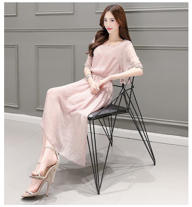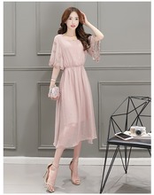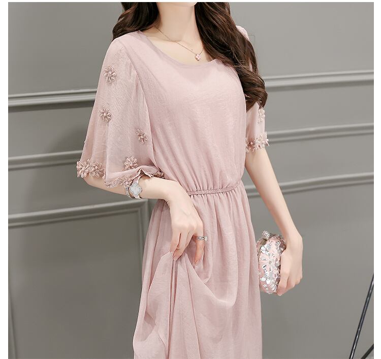 《入荷待ち》シフォン ドレス レース スカート レディース スリム ミディ丈 ミモレ丈 ベルスリーブ ワンピース 上品 五分丈