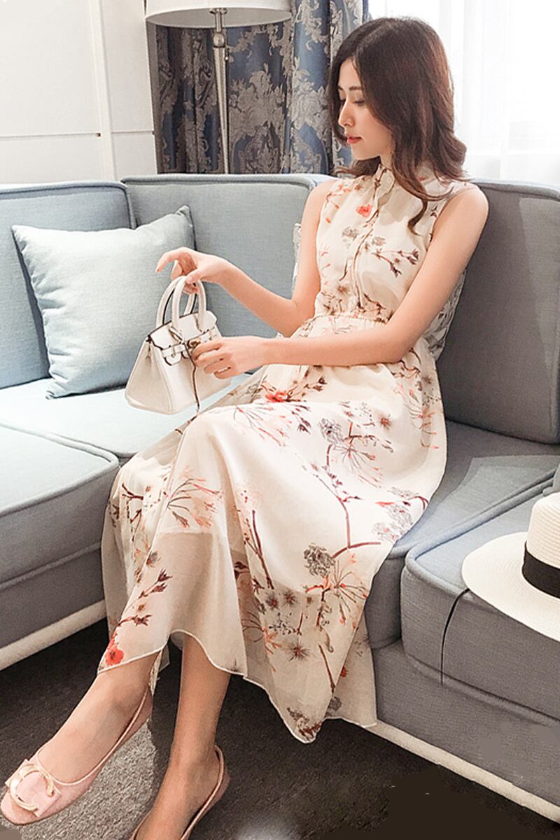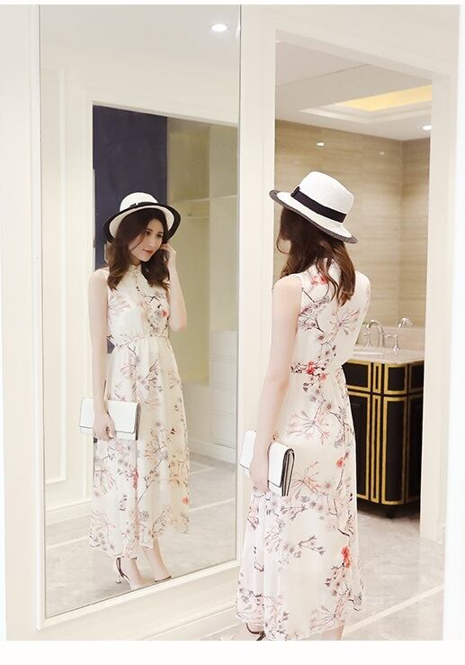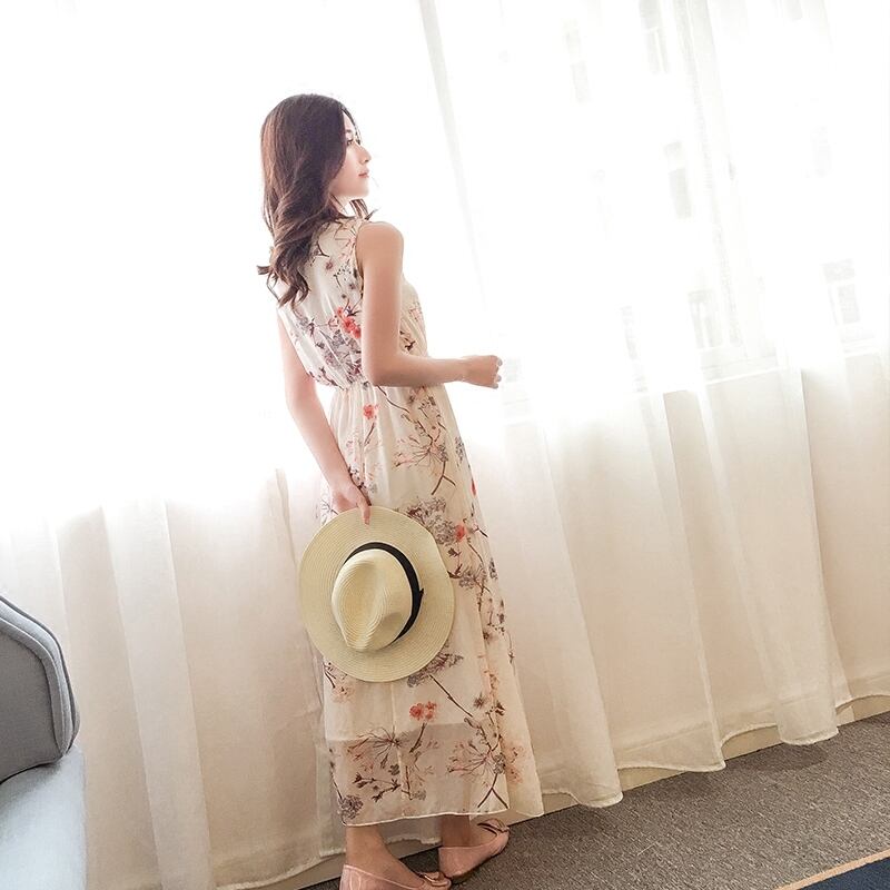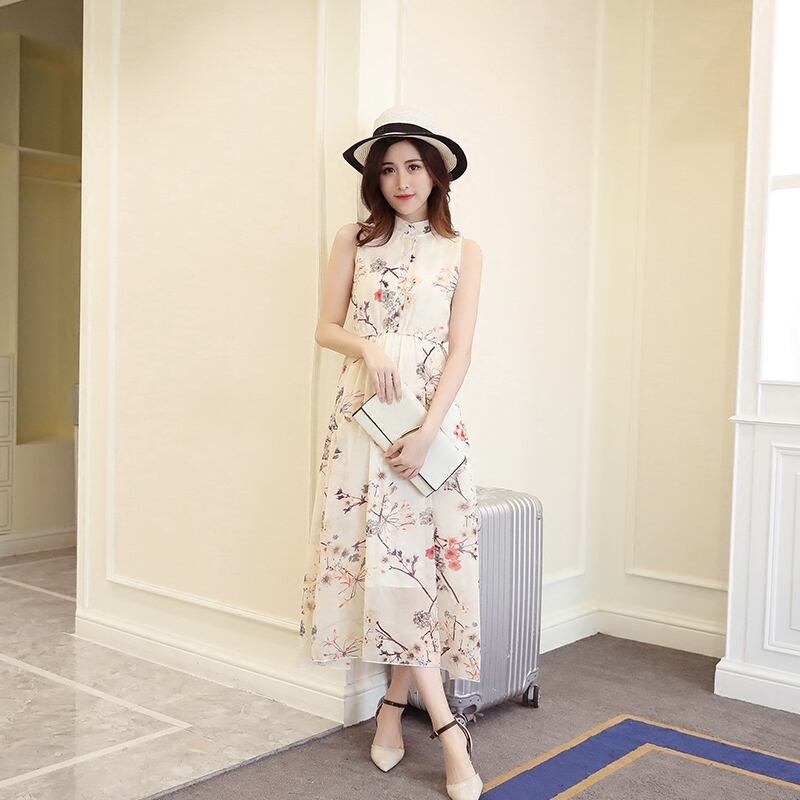 《入荷待ち》シフォンドレス ロング丈 スカート ベージュ ノースリーブ レギュラー 花柄 ワンピース 華やか フェミニン