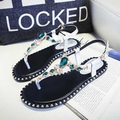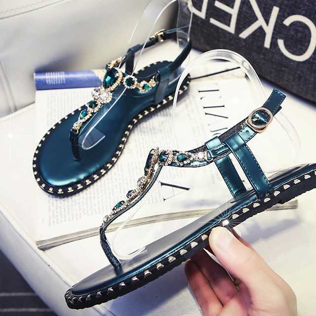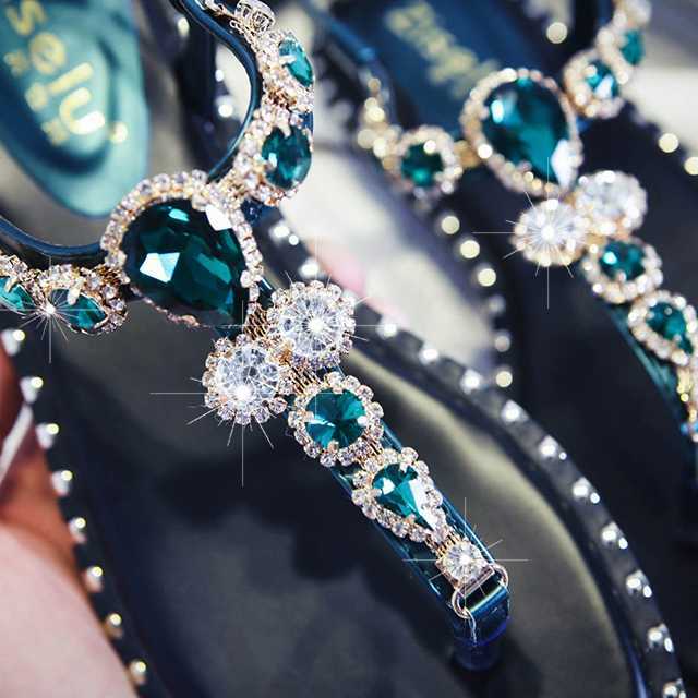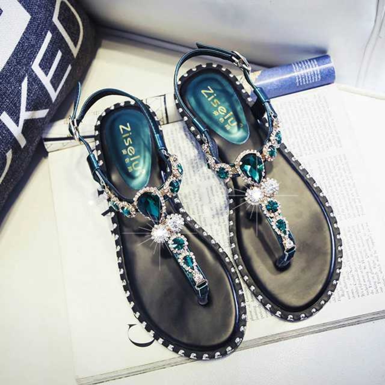 《入荷待ち》フラットサンダル アンクルストラップ ラインストーン ブラック シルバー グリーン 小さいサイズ 大きいサイズ