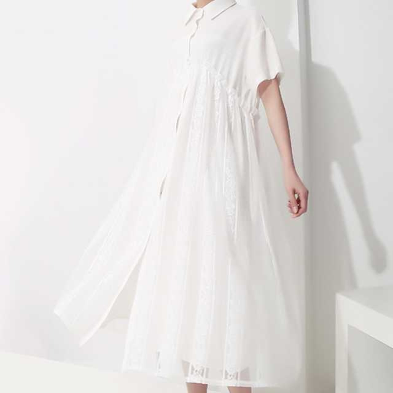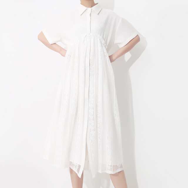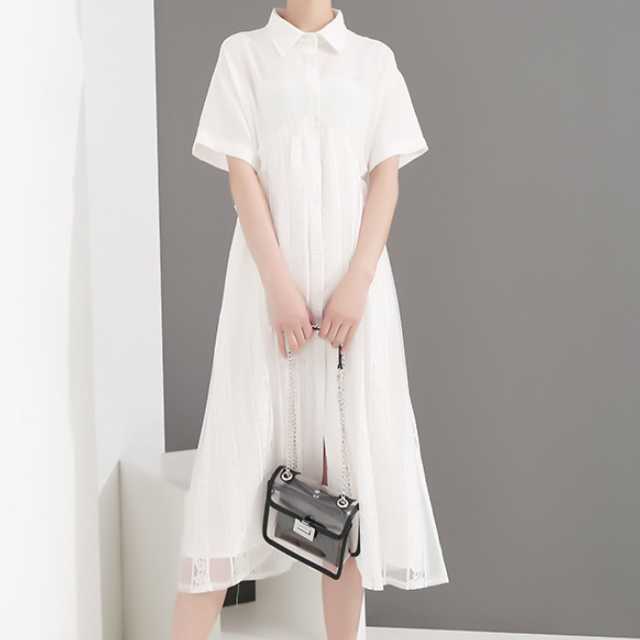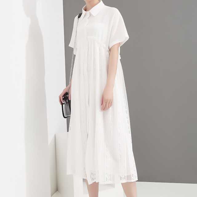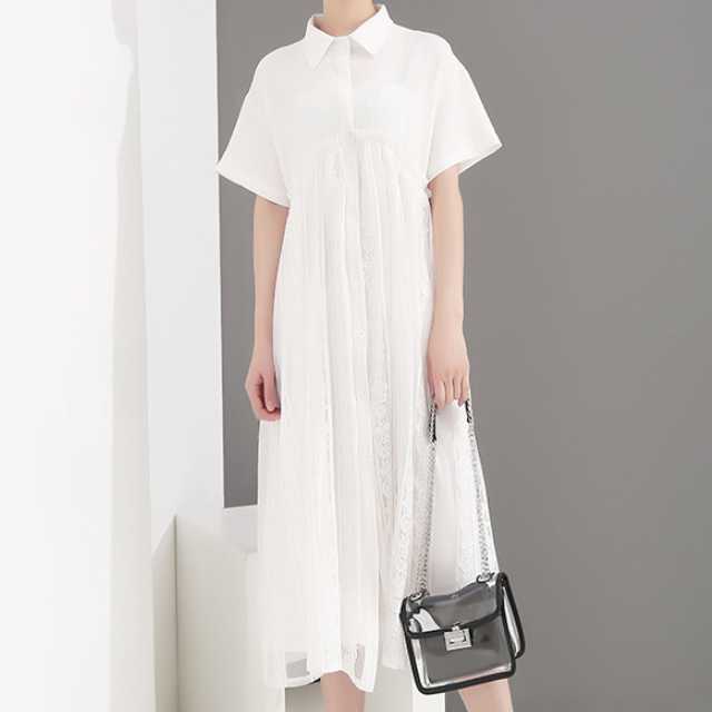 《入荷待ち》ワンピース シャツワンピース レース 半袖 ミモレ丈 ホワイト ブラック 春 夏 大人可愛い シンプル