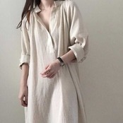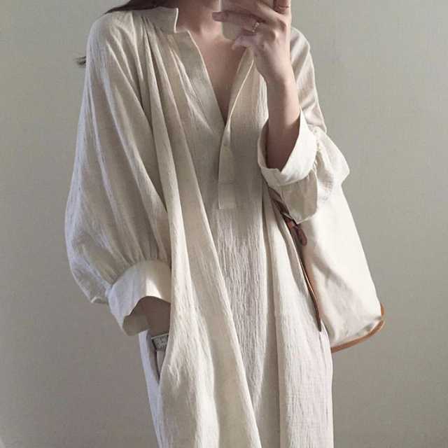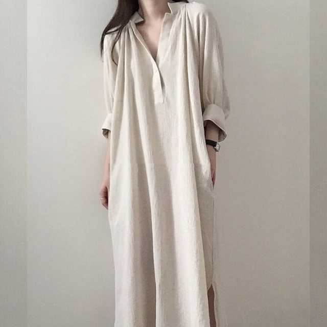 《再入荷》ワンピース シャツワンピース 七分袖 ミモレ丈 ロング丈 無地 オフホワイト シンプル カジュアル 大きいサイズ