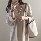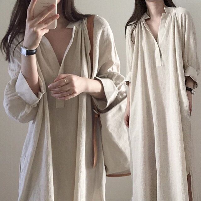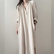 ゆったりとしたシルエットながらも、広めに開いた襟ぐりと裾のスリットが女性らしさをプラスしてくれます。