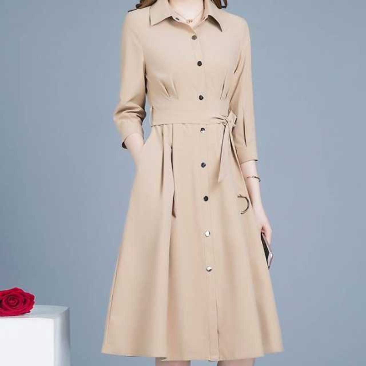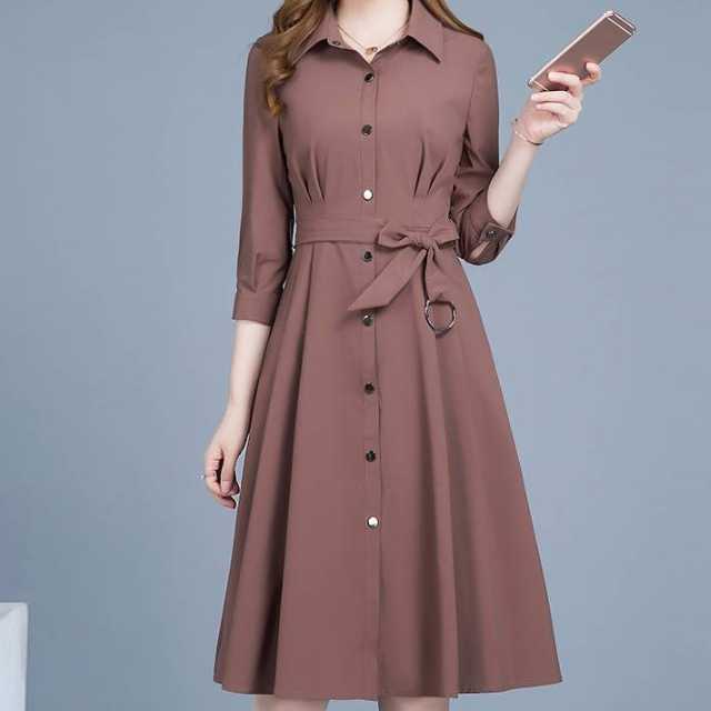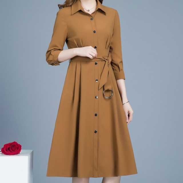 ワンピース トレンチワンピース 七分袖 ミモレ丈 ベージュ ブラウン モカ シンプル きれいめ 大きいサイズ