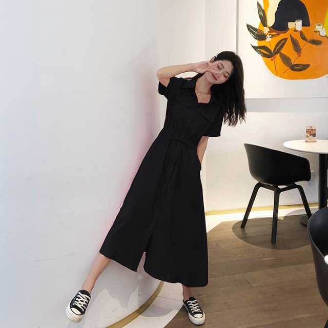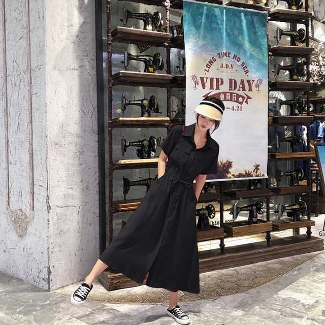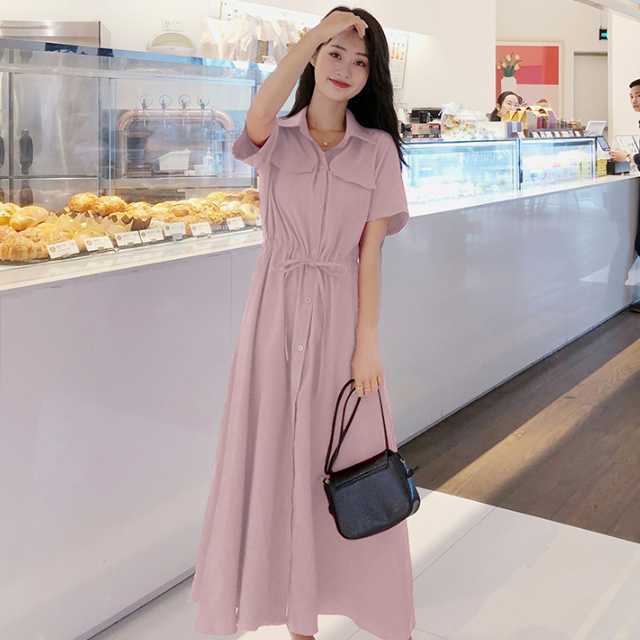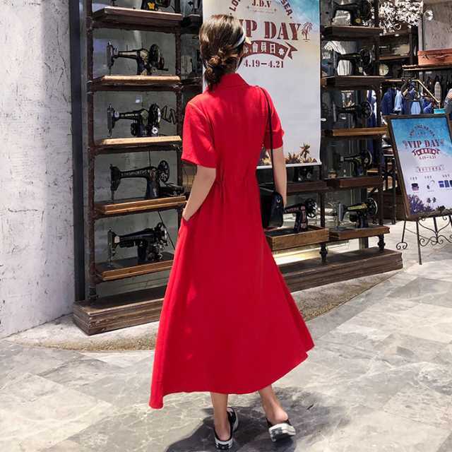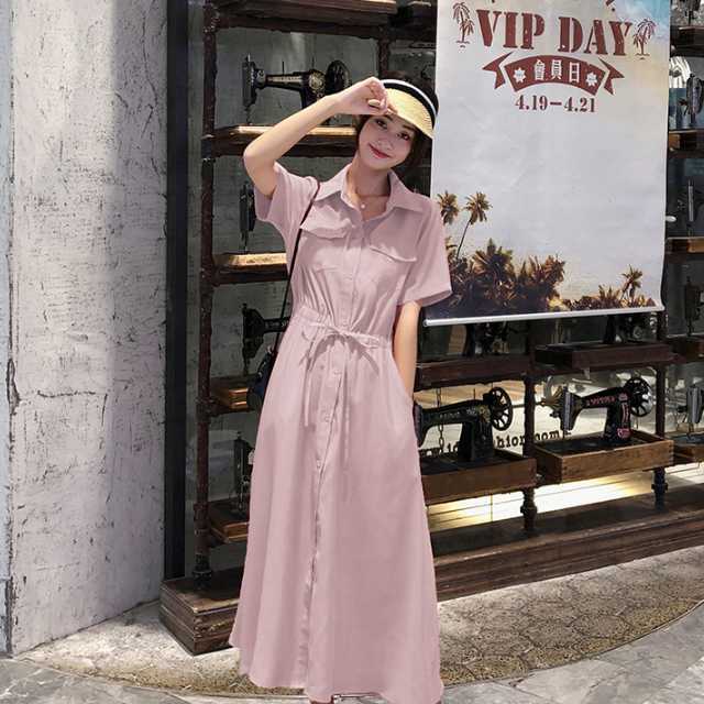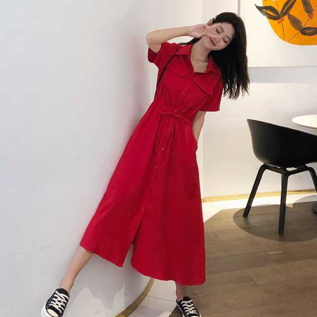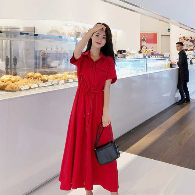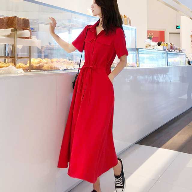 《入荷待ち》ワンピース シャツワンピース 半袖 ミモレ丈 ロング丈 レッド ブラック ピンク 無地 シンプル カジュアル