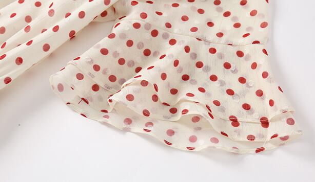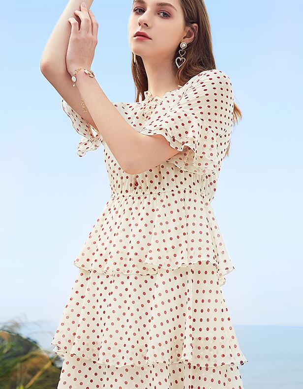 《入荷待ち》ドット シフォンフリルワンピース ひざ丈 レトロ 大人可愛い ティアード 半袖 水玉 トレンド 春 夏 ハイウエスト