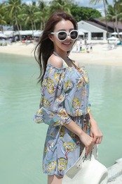 オールインワンを着用することでラフでカジュアルなビーチスタイルに様変わり。
