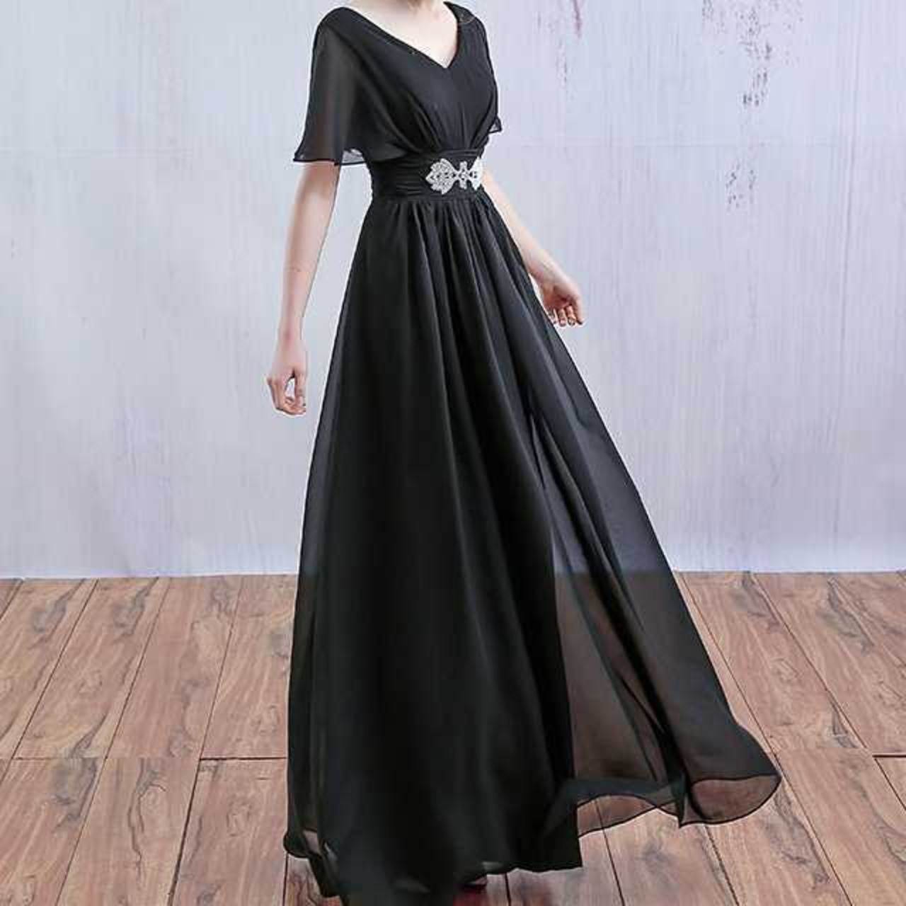 ドレス パーティードレス Vネック ハイウエスト ウエストマーク マキシ丈 半袖 無地 ブラック レッド パープル シンプル エレガント オケージョン